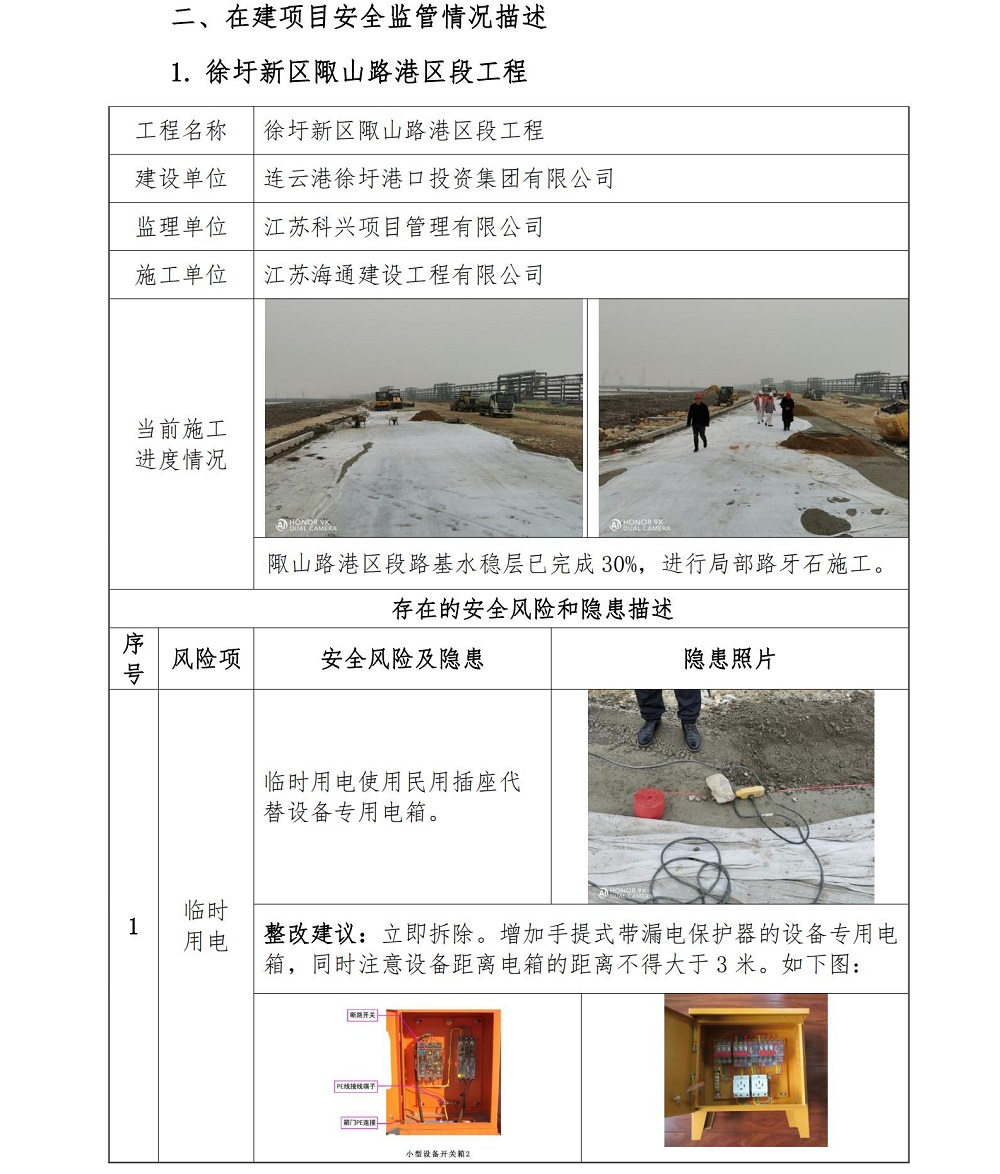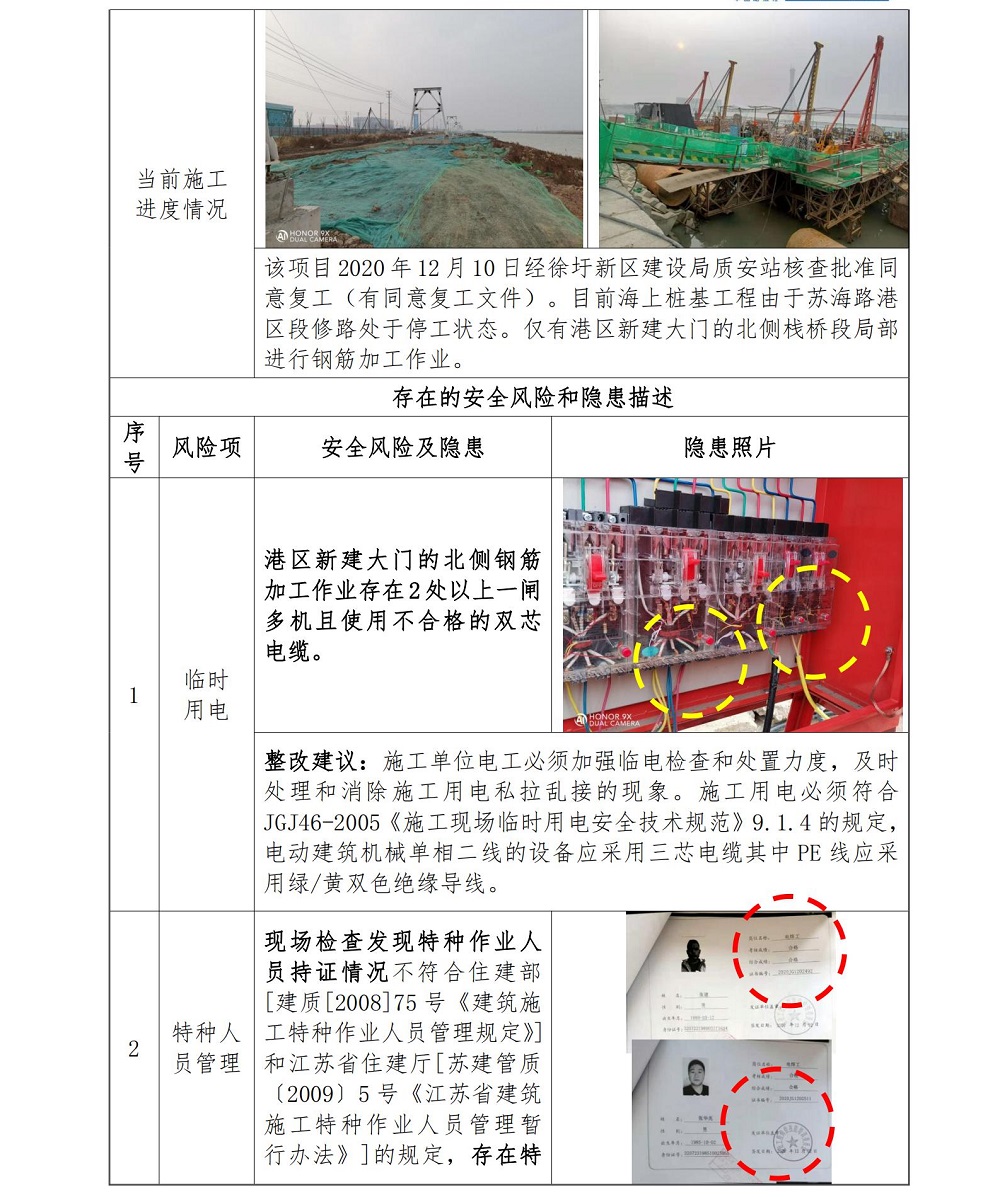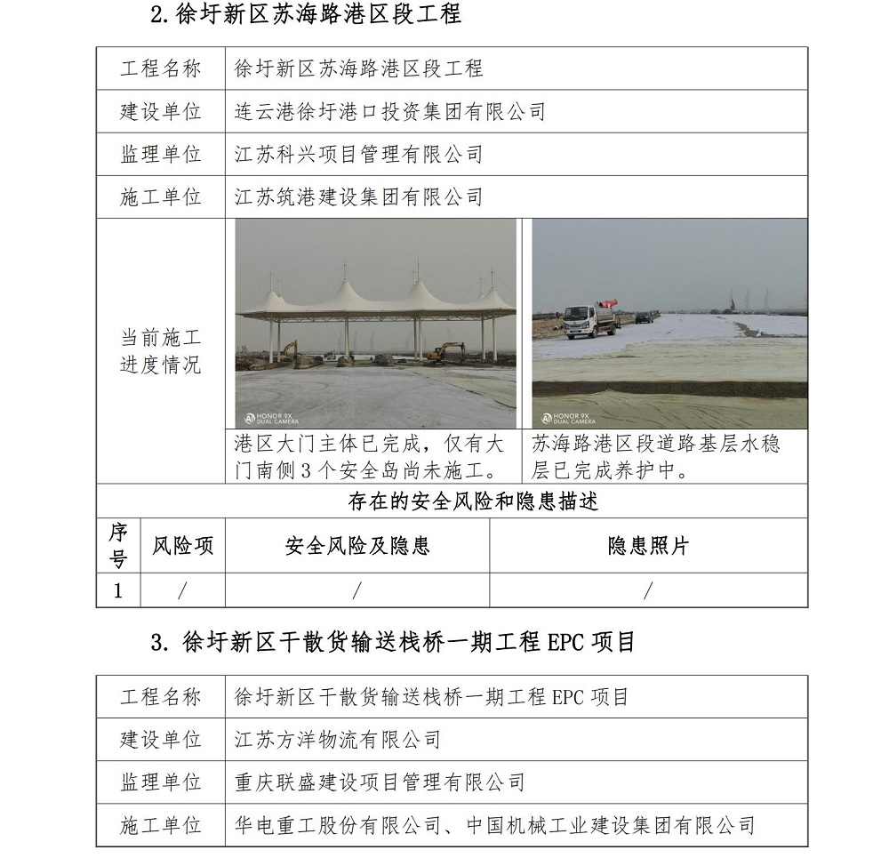2020年12月11日,中国船级社质量认证公司万象城(中国)安全监管项目组依据万象城官方网站各项安全生产管理制度和《中国船级社质量认证公司江苏万象城(中国)建设工程安全监管服务项目实施方案》,分别对连云港徐圩港口投资集团有限公司建设的徐圩新区陬山路港区段工程、徐圩新区苏海路港区段工程;江苏方洋物流有限公司建设的徐圩新区干散货输送栈桥一期工程 EPC 项目的施工安全管理情况进行检查。