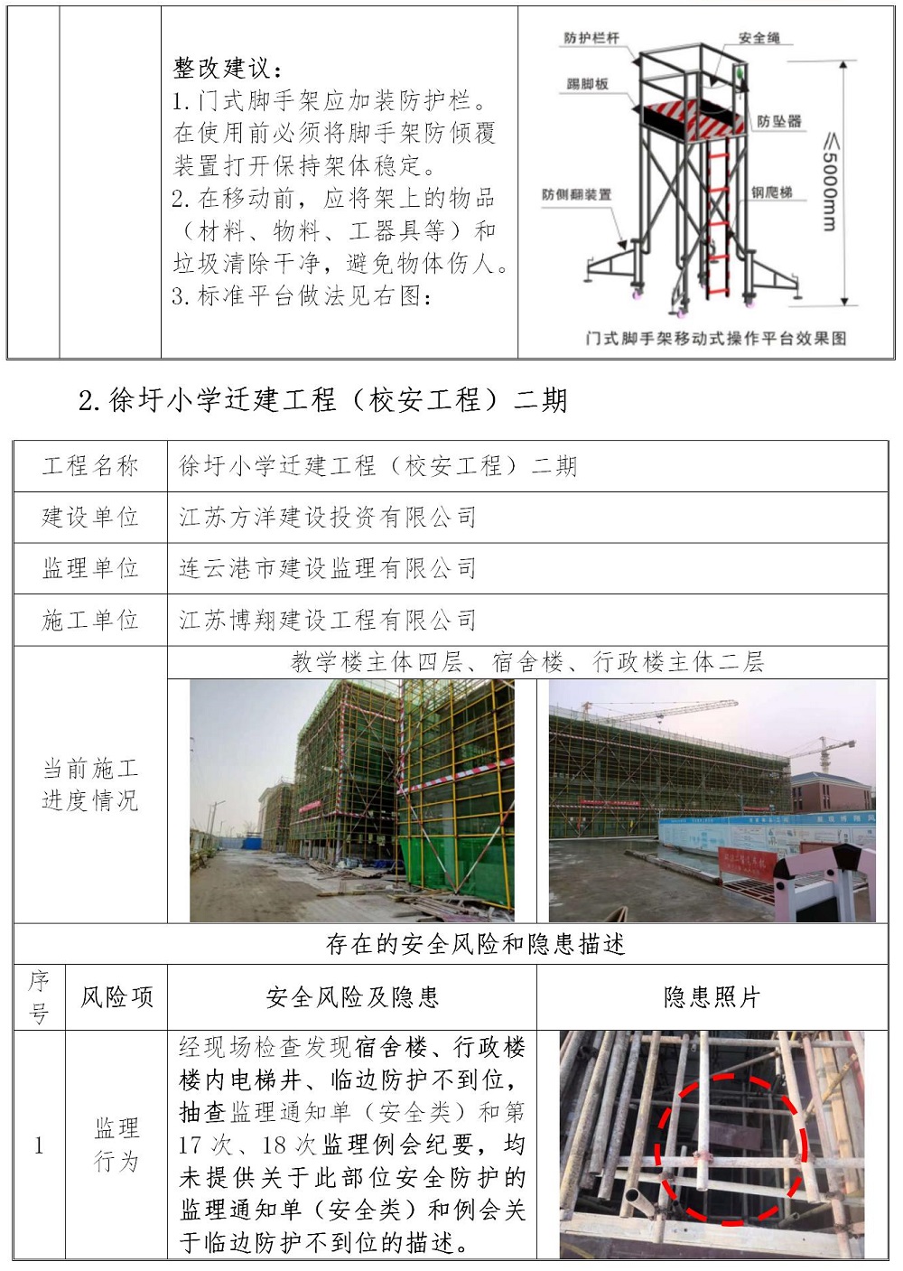 2020年12月12日,中国船级社质量认证公司万象城(中国)安全监管项目组依据江苏万象城(中国)有限公司各项安全生产管理制度和《中国船级社质量认证公司江苏万象城(中国)建设工程安全监管服务项目实施方案》,分别对现代服务集团建设的徐圩新区节能环保科技园工业邻里中心服务区配套(酒店部分)室内装修;江苏方洋建设投资有限公司建设的徐圩小学迁建(校安工程)二期工程的施工现场安全管理情况进行复查。