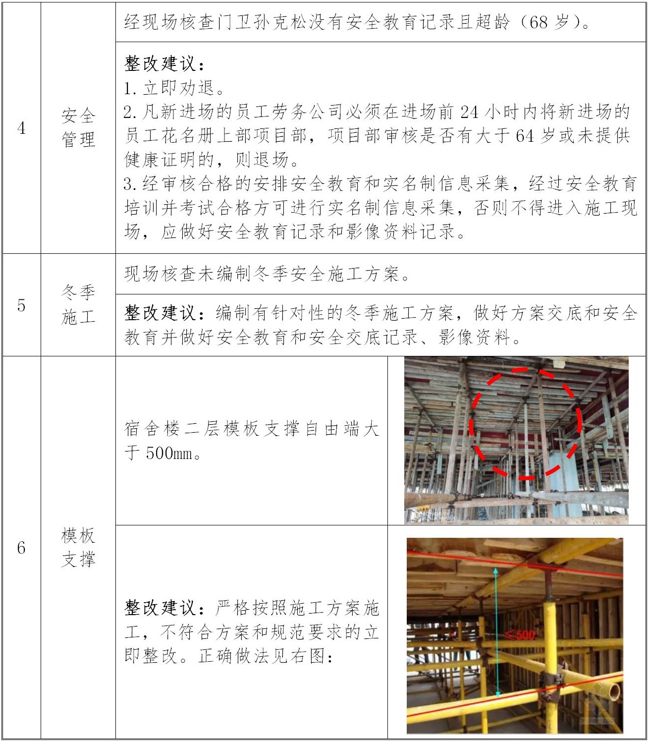 项目组坚持秉承公平、公正、严谨的工作态度,以“消除事故隐患,筑牢安全防线”为安全监管主题,着重对施工现场的三方安全责任主体管理人员履职、现场日常安全管理、施工起重机械、临时用电、模板支撑、脚手架搭设、高处作业、消防安全、冬季施工安全管理等方面结合施工现场的实际情况进行针对性的安全检查。