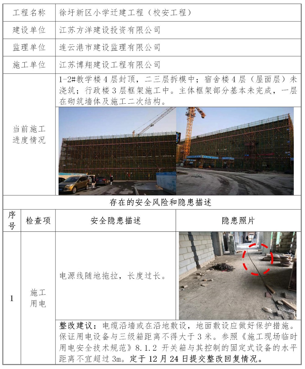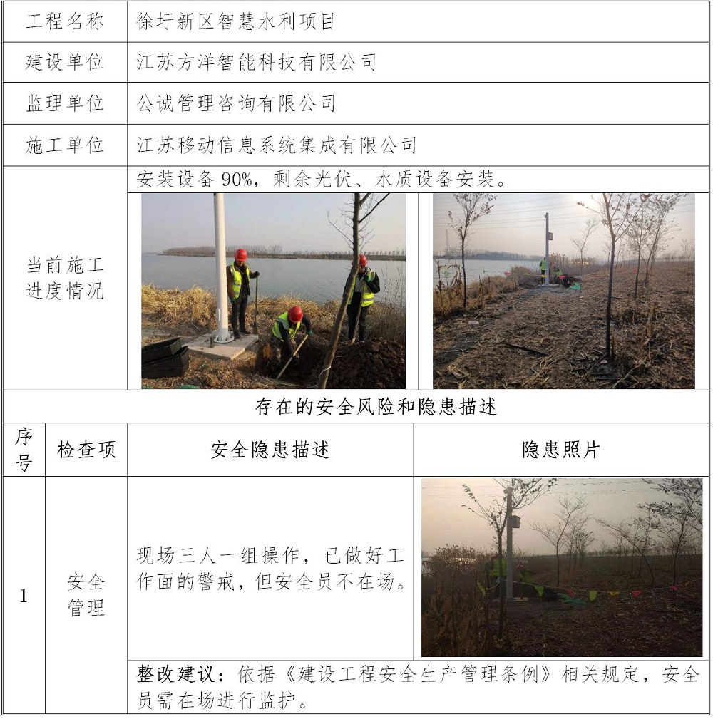 今日共检查2个在建项目(水利工程1项,房屋建筑工程1项),签发《安全隐患限期整改通知书》1份,提出整改意见4条。水利工程主要是光伏的安装,三人一组施工,主要是临近水边但有安全警戒标识。校安工程暂时除卸料平台(均有审批过的专项施工方案)外无较大危险源。具体检查情况及检查中发现的安全隐患情况描述如下: