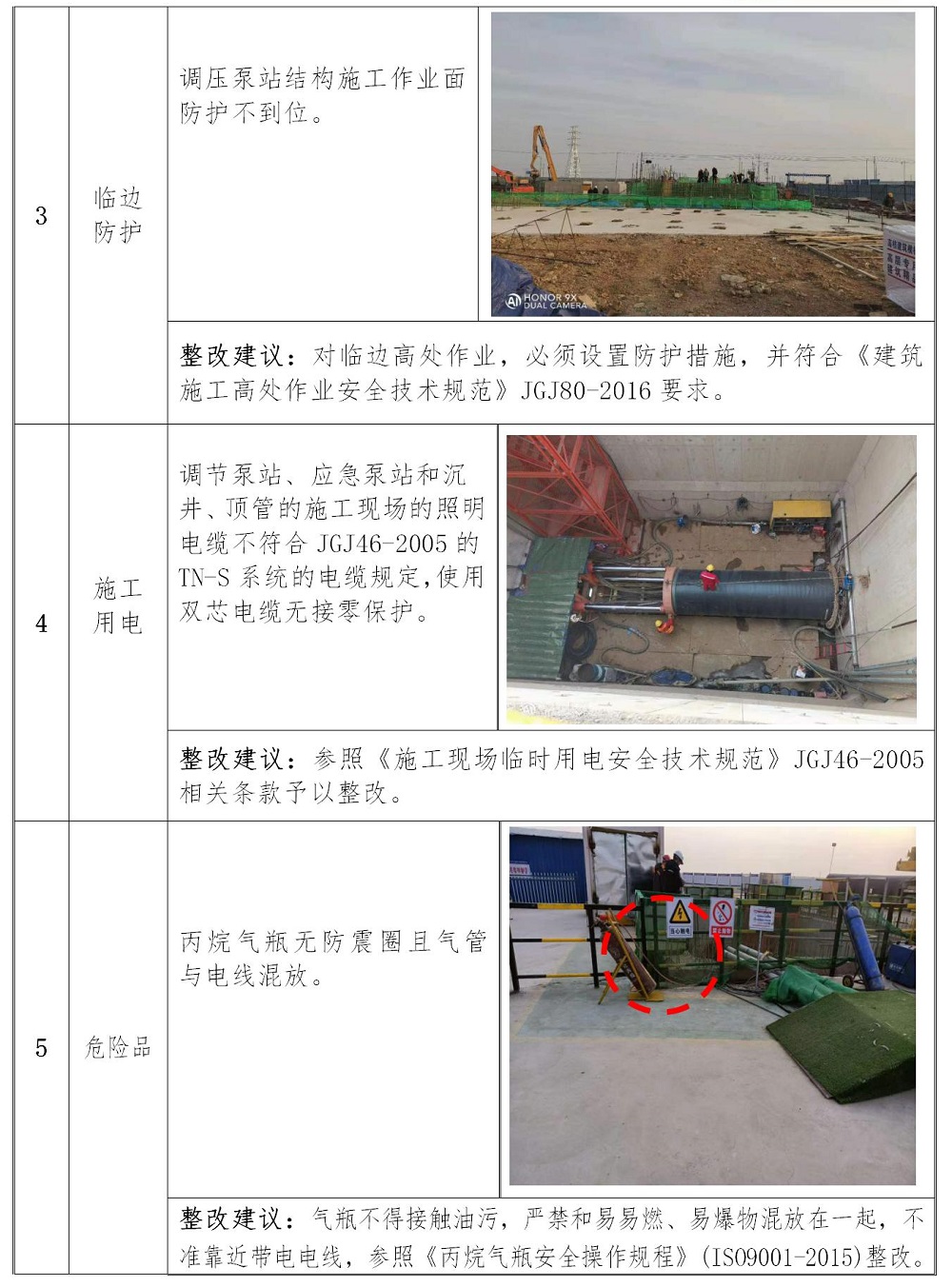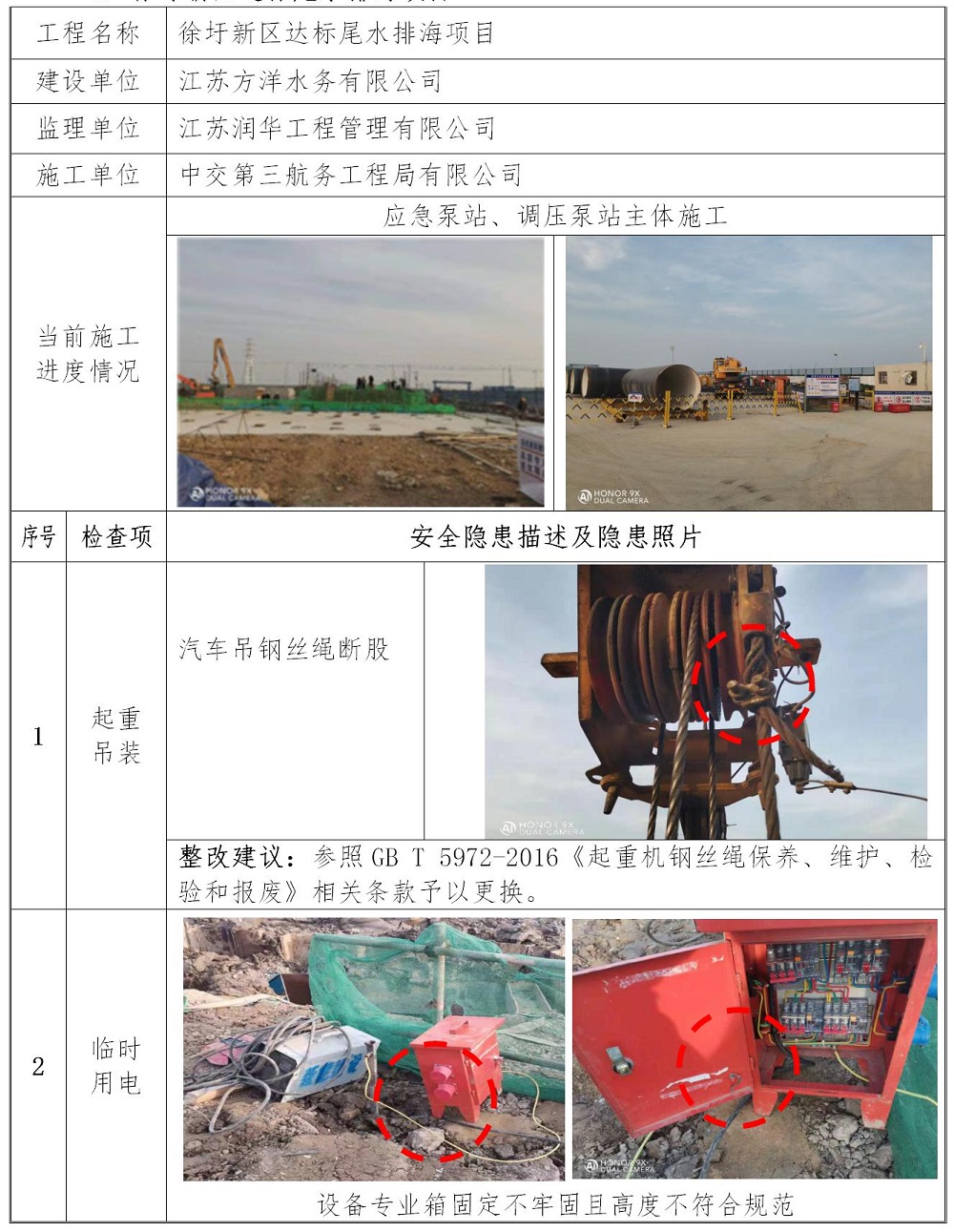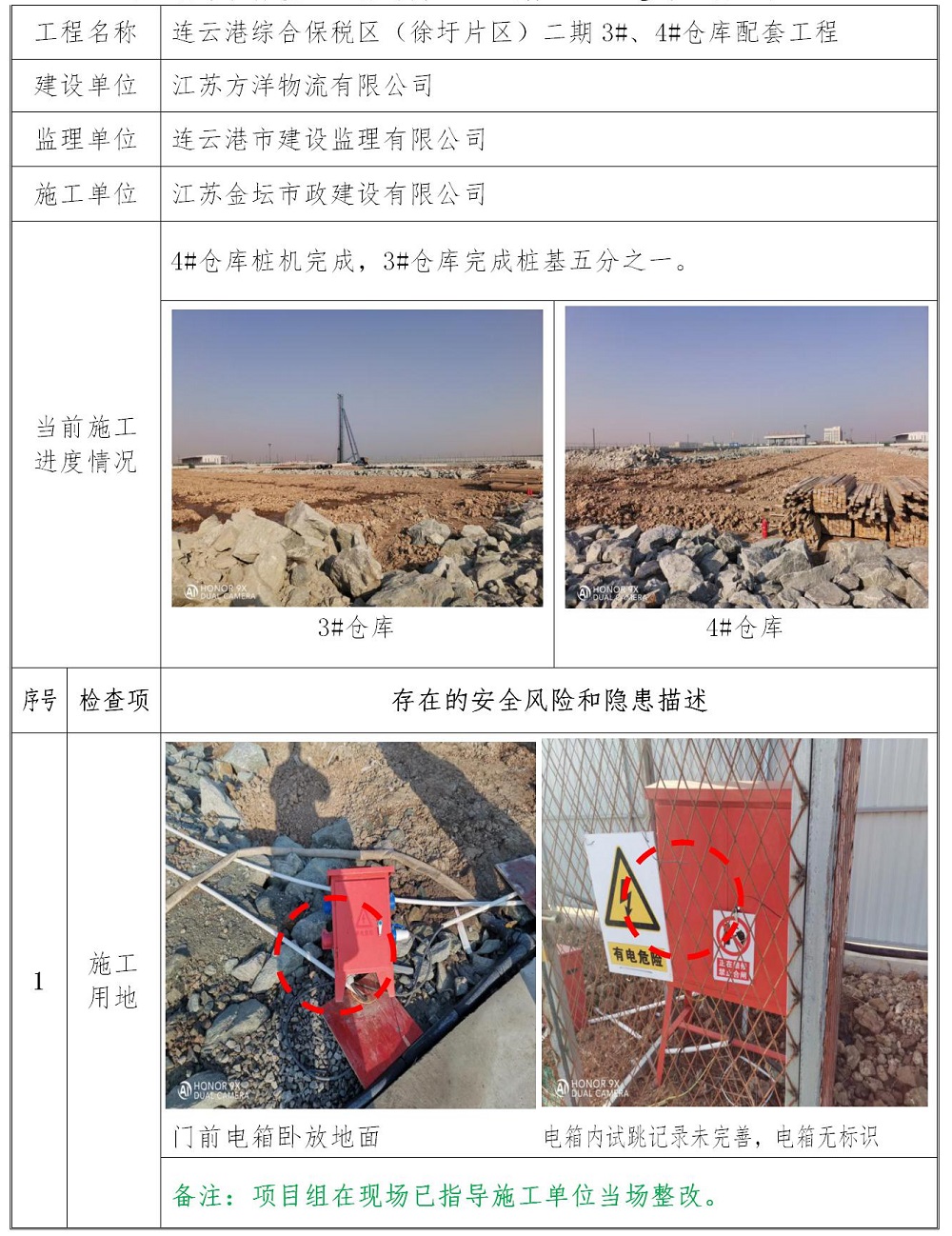 2020年12月25日,中国船级社质量认证公司万象城(中国)安全监管项目组依据江苏万象城(中国)有限公司各项安全生产管理制度和《中国船级社质量认证公司江苏万象城(中国)建设工程安全监管服务项目实施方案》,分别对江苏方洋水务有限公司的徐圩新区达标尾水排海工程、江苏方洋物流有限公司的连云港综合保税区(徐圩片区)二期3#4#仓库及室外配套工程日常安全管理、安全资料,结合被检工程的特点对涉及的危大工程、施工机械设备、临时用电、临边洞口防护、冬季消防安全等方面进行有针对性的安全检查。现场签发《安全隐患限期整改通知书》2份,提出整改意见9条。具体检查情况及检查中发现的安全隐患情况描述如下: