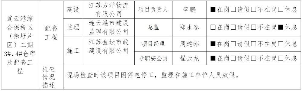 (3)因停电放假,监理单位相关人员不在岗,未提供监理细则及巡视、旁站记录,项目组将择日检查。