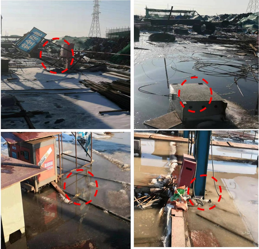 现场要求:修整倾倒的临时用电防护棚、电箱;抽干钢筋加工区内的积水,泡在水里的电缆易造成短路及漏电的危险性,建议架线搭设。