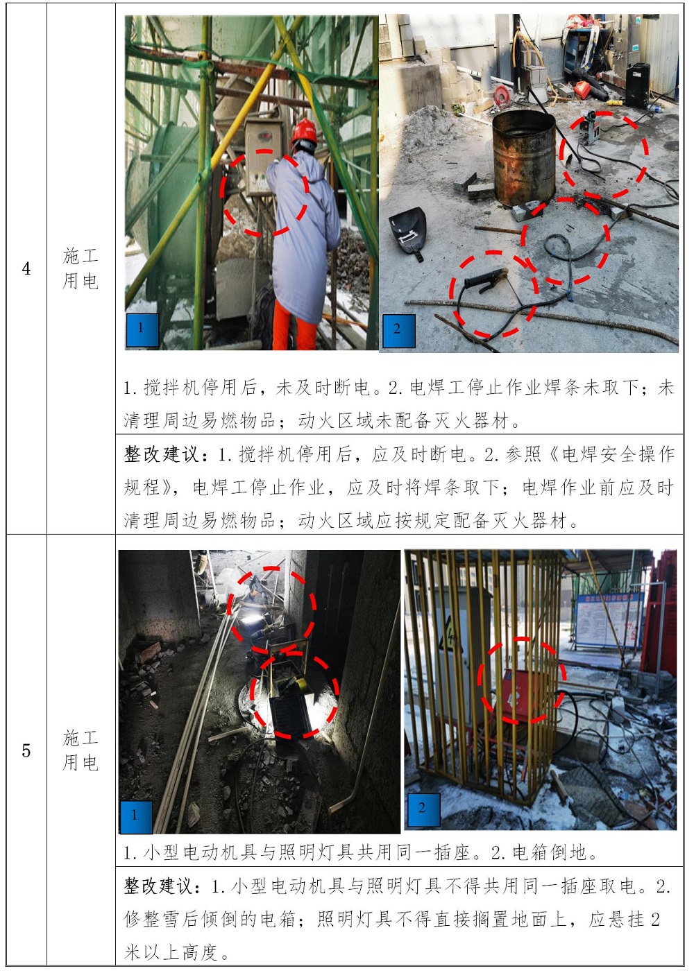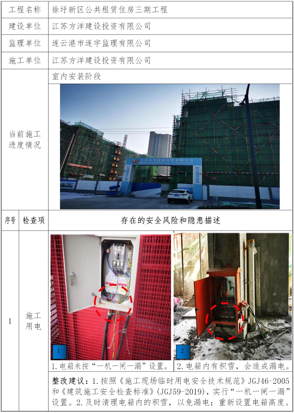徐圩新区公共租赁住房三期工程已进入室内安装阶段,现场临时用电私拉乱接现象严重,搅拌机、电焊机及小型电动机具等停用后均未及时断电。目前本项目重大风险在于临时用电管理,建议各相关方进行临时用电专项检查和整改。