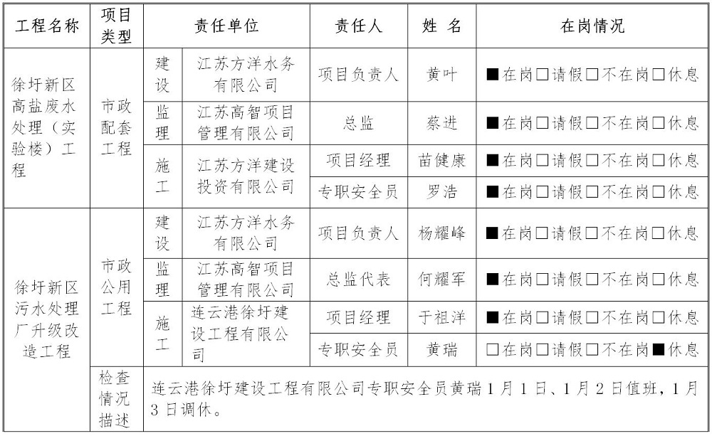 2021年1月3日,中国船级社质量认证公司万象城(中国)安全监管项目组对江苏方洋水务有限公司的徐圩新区高盐废水处理(实验楼)工程、徐圩新区污水处理厂升级改造工程的施工现场安全管理情况进行复查和巡查。