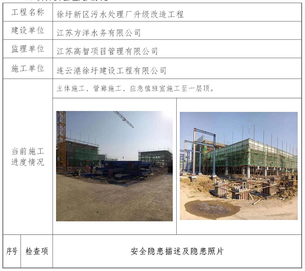 2021年1月9日,项目组分别对徐圩新区烧香河南段综合整治工程闸站工程、河道疏浚工程1标段、2标段、3标段、4标段、徐圩新区污水处理厂升级改造工程冬季安全生产、消防和防寒防冻应急进行进行检查,对施工现场的人员管理情况、防疫措施、防疫物资、安全生产情况进行告知并提醒全力做好防范工作。检查组告知,建设单位要承担疫情防控和安全生产的首要责任;施工单位要全面摸排施工人员情况,储备充足防疫物资,全面排查整治安全隐患,开展全员、全覆盖的防疫及安全培训,严格施工现场过程管控,加强生活区管理,强化突发事件应急处置,切实承担项目疫情防控和安全生产的主体责任;监理单位监督好疫情防控和安全生产的监理责任,切实把疫情防控工作落到实处,确保项目的安全施工。具体检查情况如下: