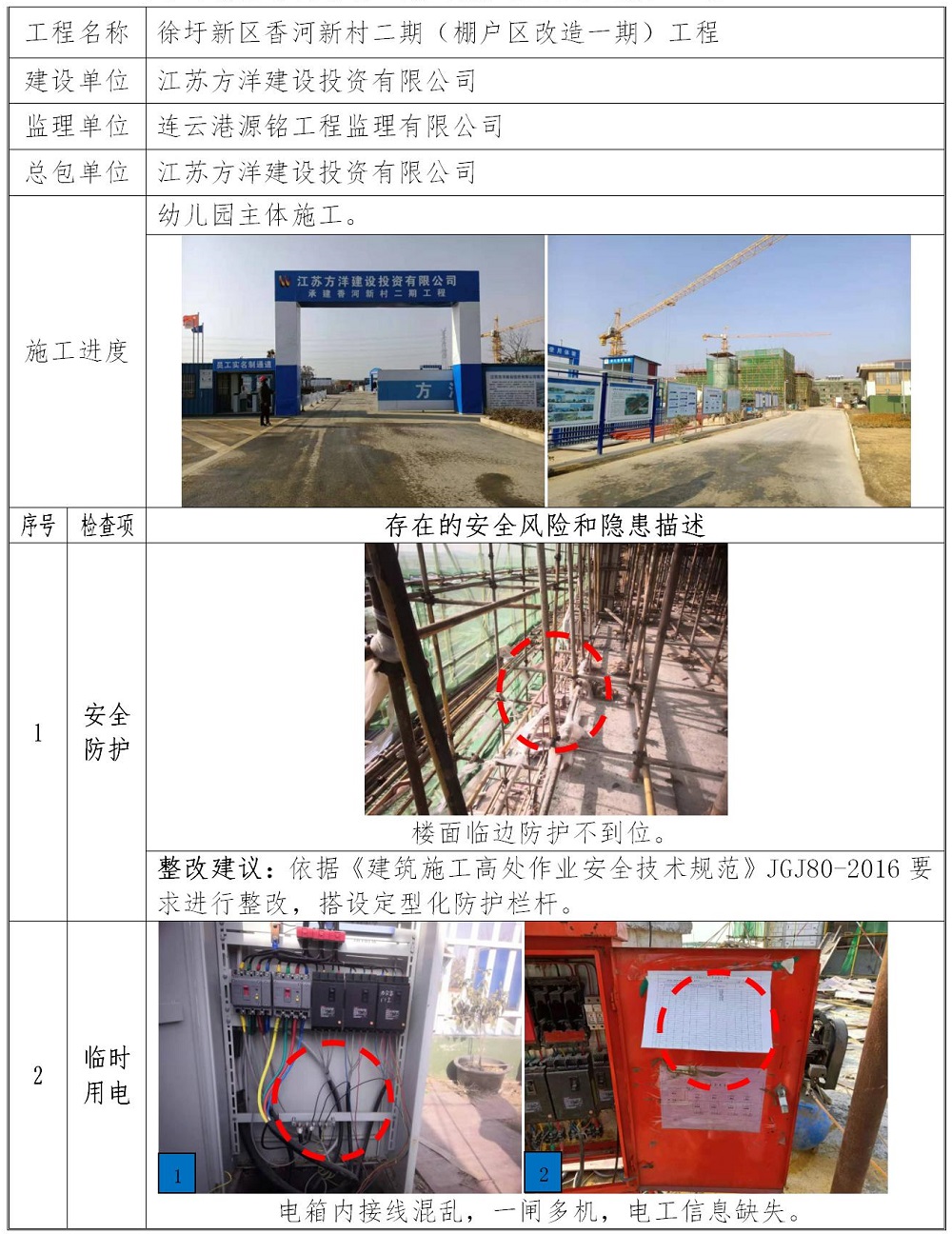 2021年1月17日,项目组对江苏方洋建设投资有限公司的徐圩新区香河新村二期(棚户区改造一期)工程、徐圩小学迁建工程(校安工程)二期施工现场安全生产情况进行检查,并对防疫管控提醒告知。具体检查情况如下: