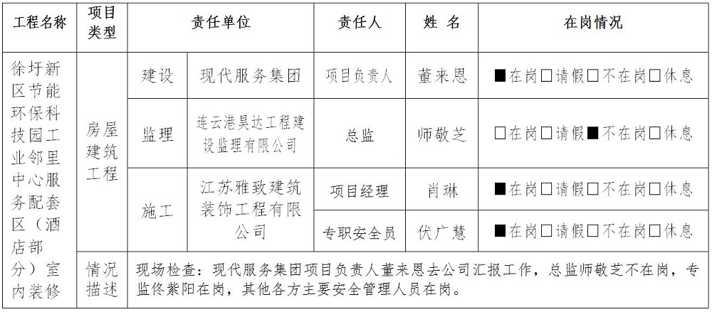 项目组对现代服务集团的徐圩新区节能环保科技园工业邻里中心服务配套区(酒店部分)室内装修工程安全生产进行现场监督检查,提醒并告知该项目参建单位及人员严格落实疫情防控责任,确保疫情防控和安全生产保障措施落实到位,加强疫情防控知识的宣传,提高从业人员的防控意识和防控能力。项目组要求该项目部做好春节前安全检查,抓好消防和临时用电安全管理,针对发现的安全隐患,列明隐患清单、责任清单、整改清单,明确责任人员和整改期限,确保责任到位、检查到位、整治到位、各项安全生产措施到位。
