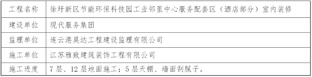 根据集团安环部的安排,2021年1月18日,项目组对江苏方洋建设工程管理有限公司安全生产管理运行体系进行帮扶指导;对现代服务集团的徐圩新区节能环保科技园工业邻里中心服务配套区(酒店部分)室内装修工程安全生产进行现场监督检查。