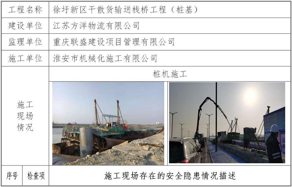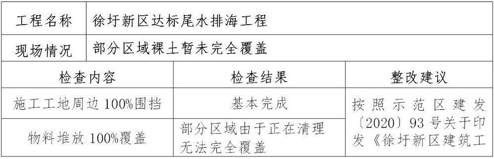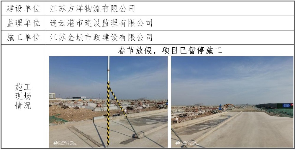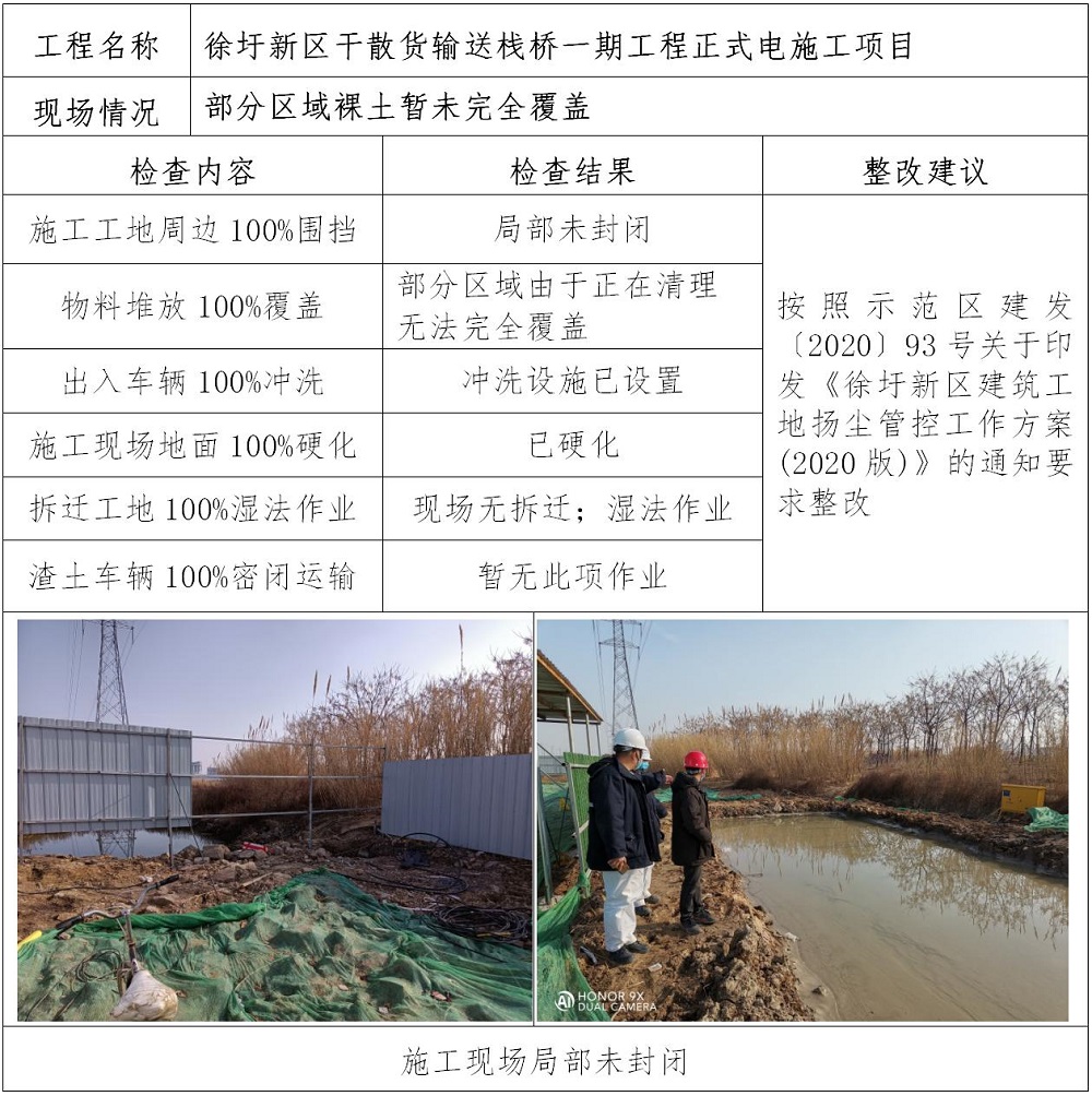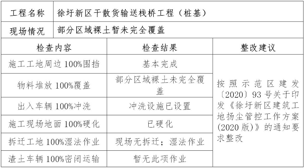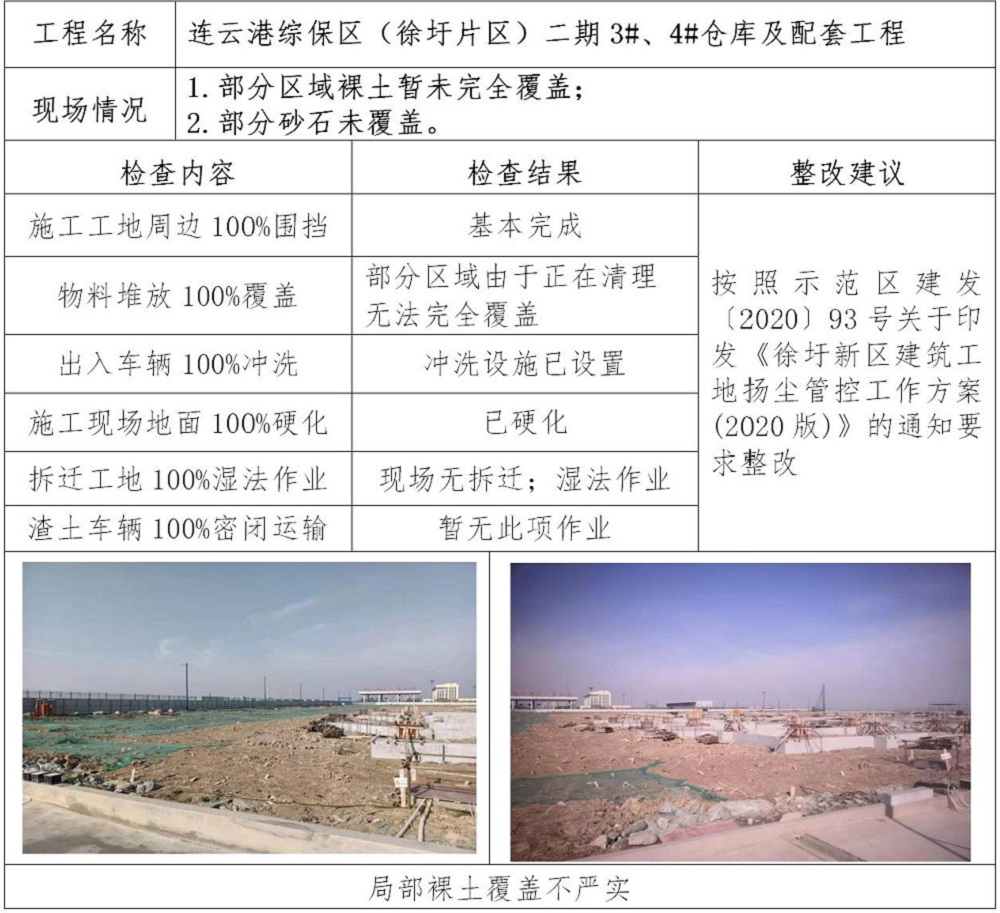为贯彻落实示范区建发〔2020〕93号关于印发《徐圩新区建筑工地扬尘管控工作方案(2020版)》的通知精神和万象城(中国)关于进一步做好在建工程扬尘治理的相关要求,2021年2月4日-5日,项目组对连云港综合保税区(徐圩片区)二期3#、4#仓库及配套工程、徐圩新区干散货输送栈桥一期工程正式电施工项目、连云港综合保税区(区块一)接线道路与桥梁工程、徐圩新区达标尾水排海工程、徐圩新区干散货输送栈桥工程(桩基)等项目开展扬尘管控专项检查。