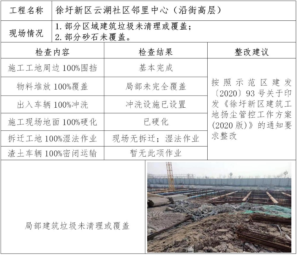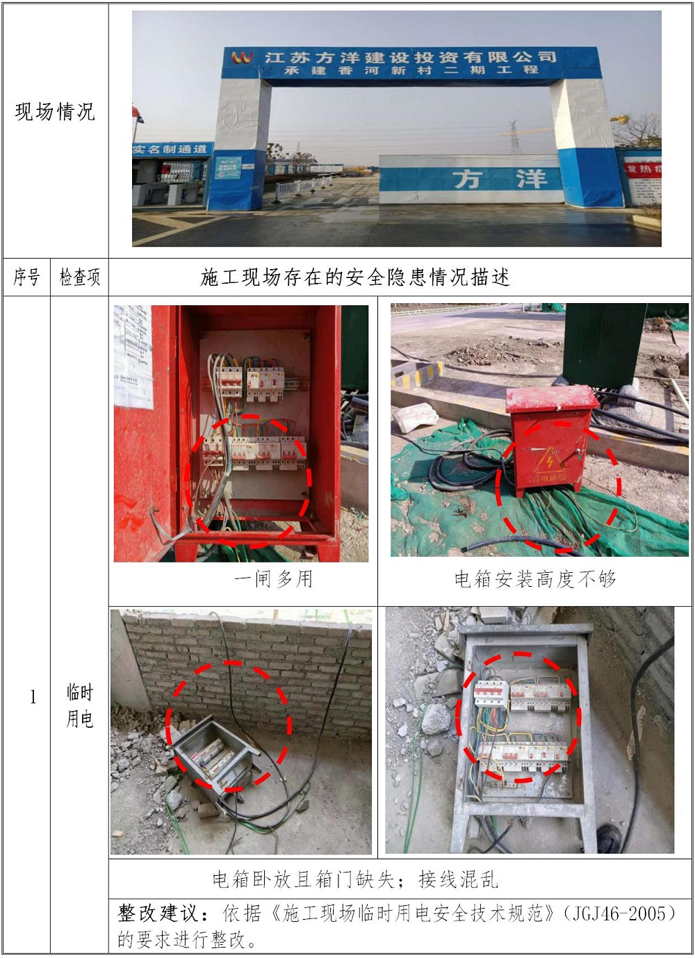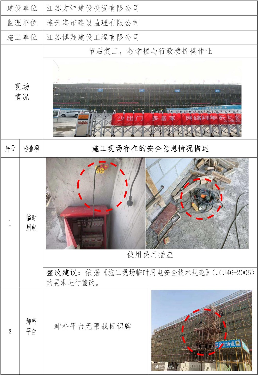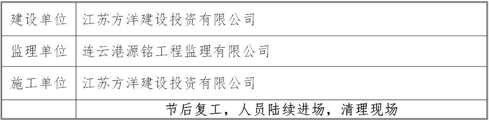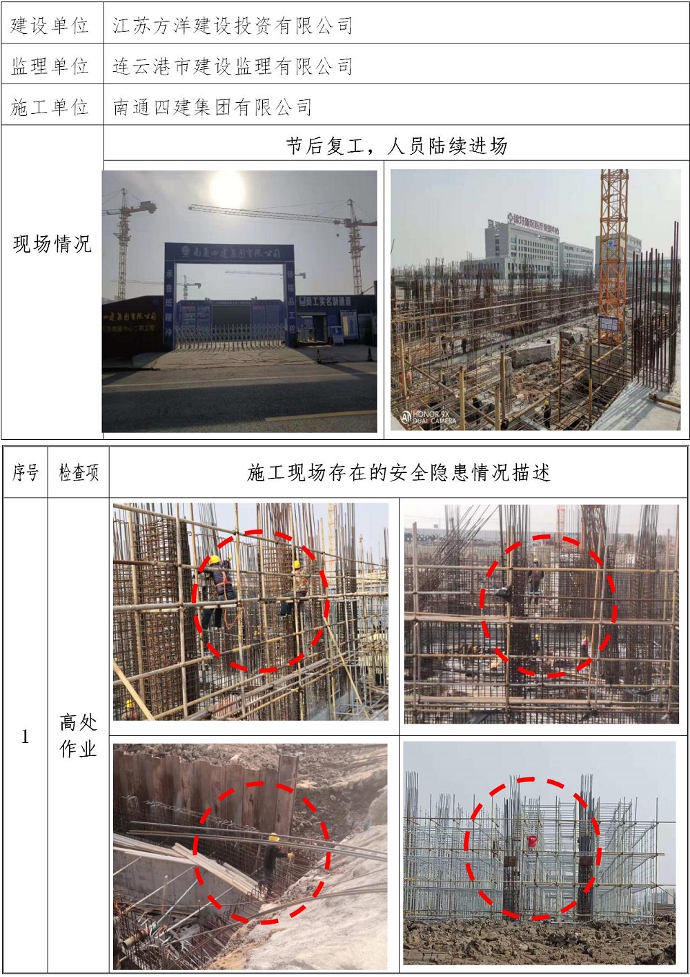 项目组通过现场查看、查阅资料和开展座谈的方式,检查了江苏方洋建设投资有限公司承建的徐圩新区医疗应急救援二期、徐圩新区香河新村二期(棚户区改造一期)工程、徐圩新区云湖社区邻里中心(沿街高层)、徐圩小学迁建工程(校安工程)二期等项目在复工前各类机械与防护设施,重点检查了塔吊、脚手架、升降机、配电箱、“三宝、四口、五临边”和扬尘污染治理情况。