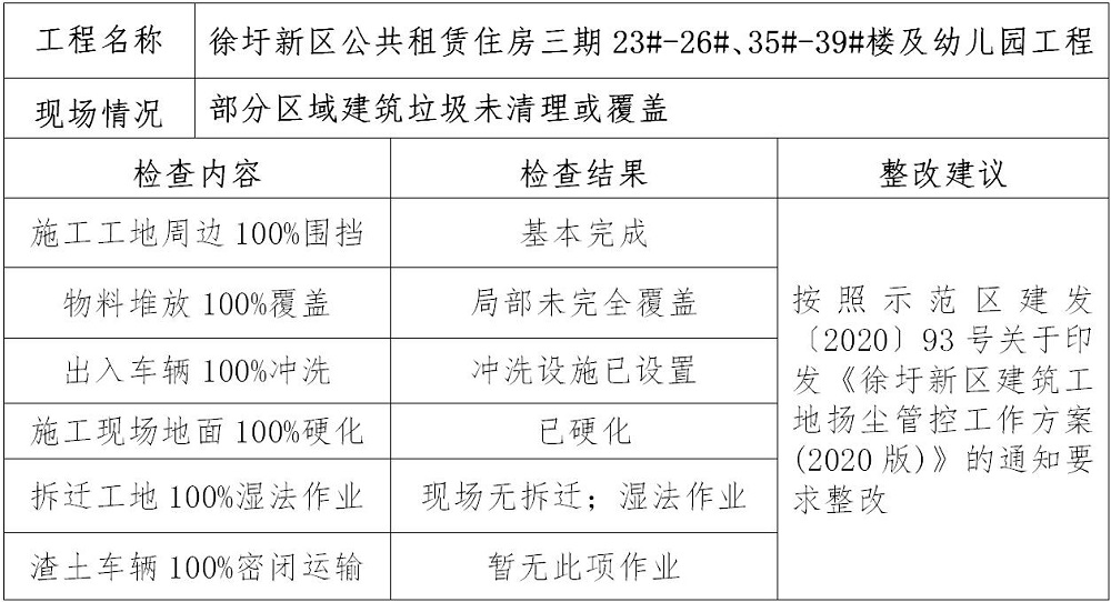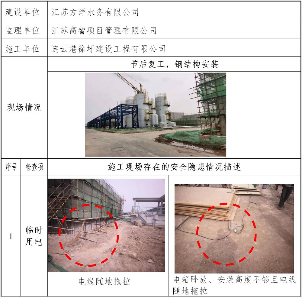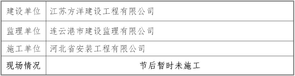 2021年2月23日,项目组对江苏方洋建设投资有限公司在建的徐圩新区公共租赁住房三期23#-26#、35#-39#楼及幼儿园工程、江苏方洋水务有限公司在建的徐圩污水处理厂升级改造工程、江苏方洋建设工程管理有限公司在建的徐圩新区应急备用水源取水泵站及配套管线工程等项目复工前各类机械与防护设施、扬尘污染治理情况进行了检查。