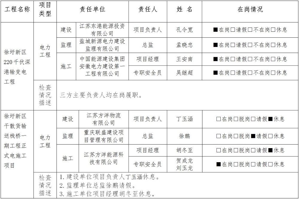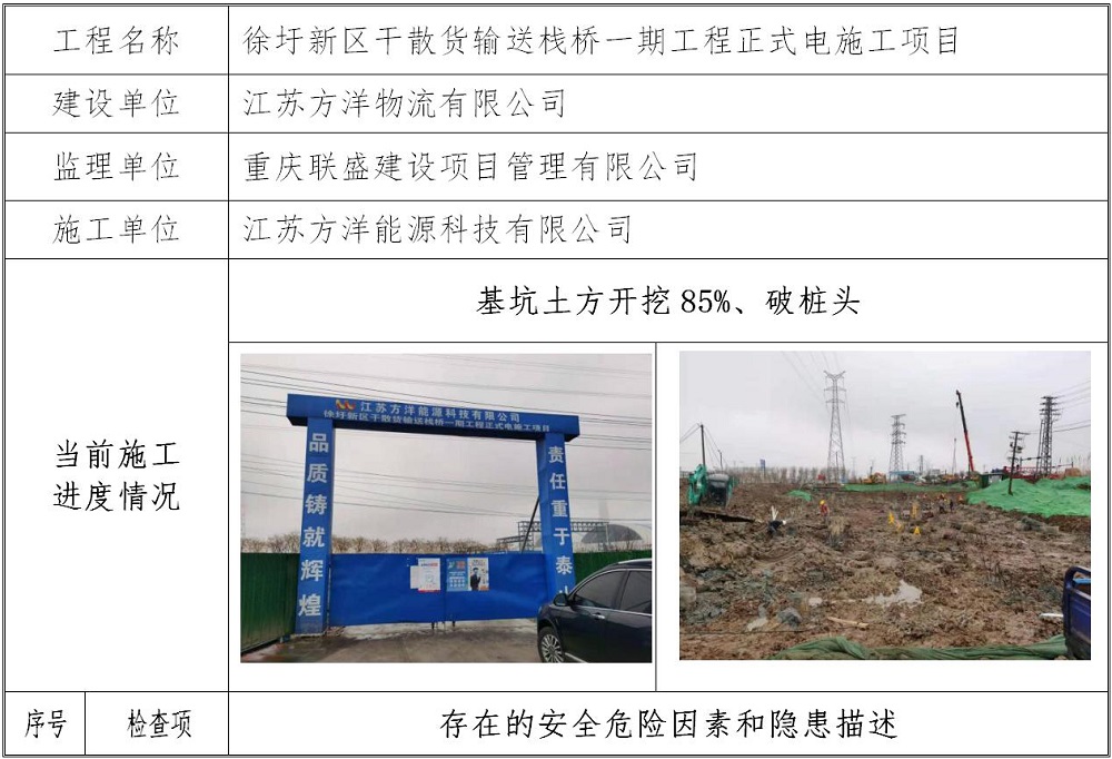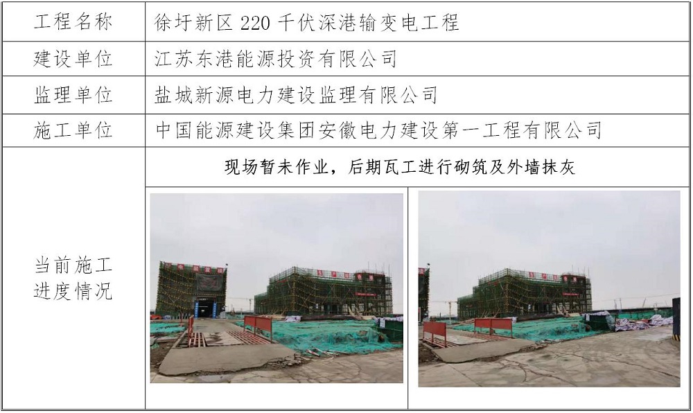 2021年2月28日,中国船级社质量认证公司万象城(中国)安全监管项目组依据江苏万象城(中国)有限公司各项安全生产管理制度和《中国船级社质量认证公司江苏万象城(中国)建设工程安全监管服务项目实施方案》,分别对江苏东港能源投资有限公司承建的徐圩新区220千伏深港输变电工程;江苏方洋物流有限公司承建的徐圩新区干散货输送栈桥一期工程正式电施工项目的日常安全管理、安全资料并结合被检工程的特点对涉及的危大工程、施工机械设备、临时用电等方面进行有针对性的安全检查。