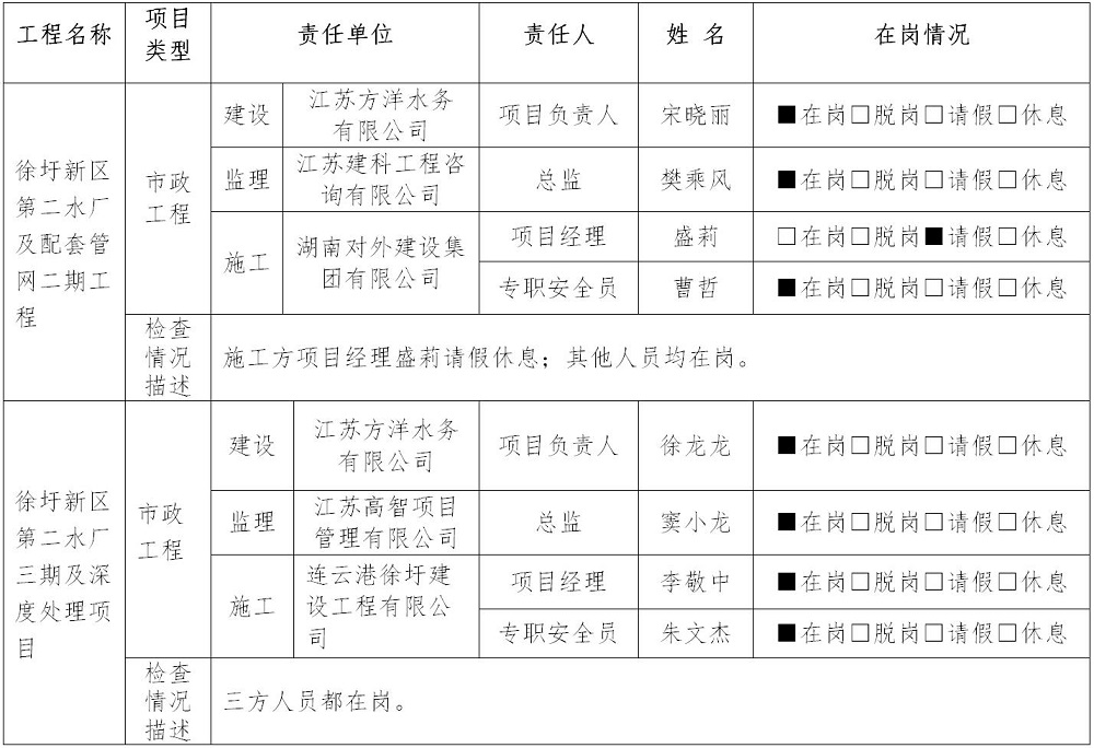 2021年3月7日,中国船级社质量认证公司万象城(中国)安全监管项目组依据江苏万象城(中国)有限公司各项安全生产管理制度和《中国船级社质量认证公司江苏万象城(中国)建设工程安全监管服务项目实施方案》,分别对江苏方洋水务有限公司承建的徐圩新区第二水厂及配套管网二期工程、徐圩新区第二水厂三期及深度处理项目的日常安全管理、安全资料并结合被检工程的特点对涉及的危大工程、施工机械设备、临时用电等方面进行有针对性的安全检查。