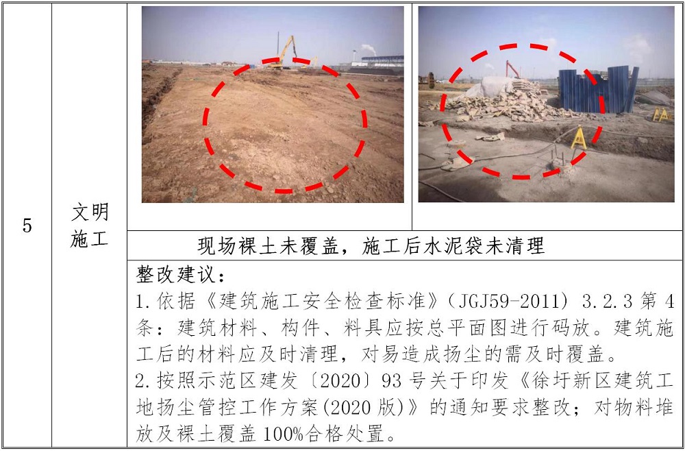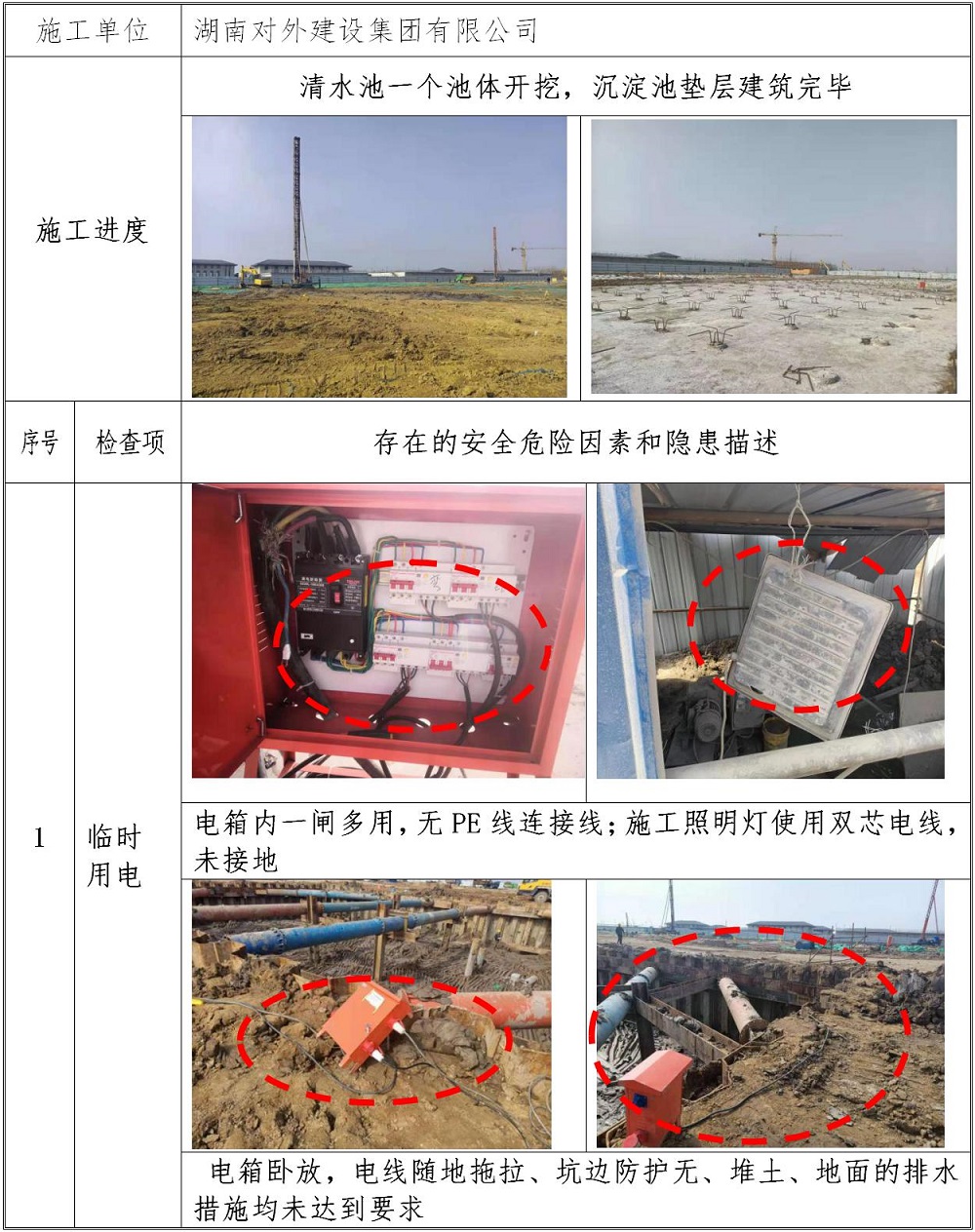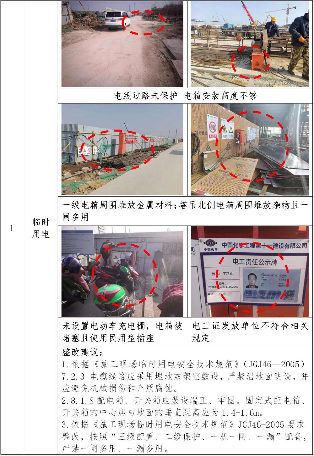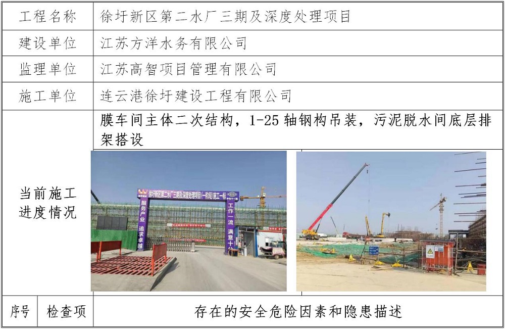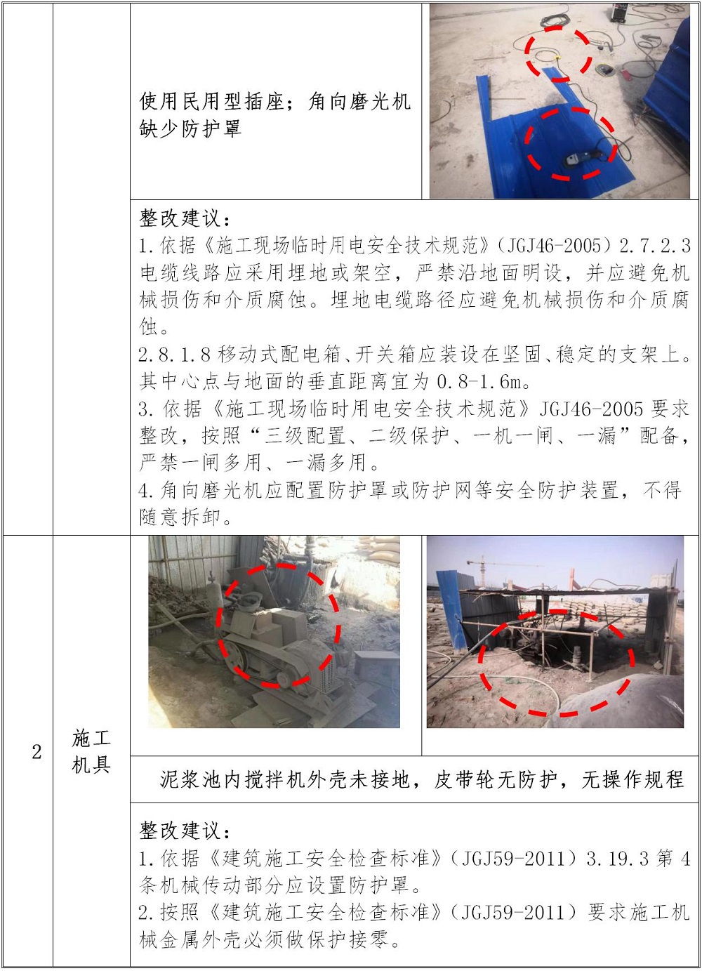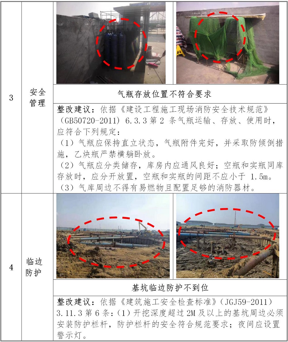 1.徐圩新区第二水厂及配套管网二期工程:临时用电、基坑工程。临时用电方面存在乱拖乱拉和电箱设置不合理等安全风险;基坑周边防护未到位,坑边堆载距离、坑边的排水设施、基坑上下通道等不符合《建筑施工安全检查标准》(JGJ59-2011)的要求。