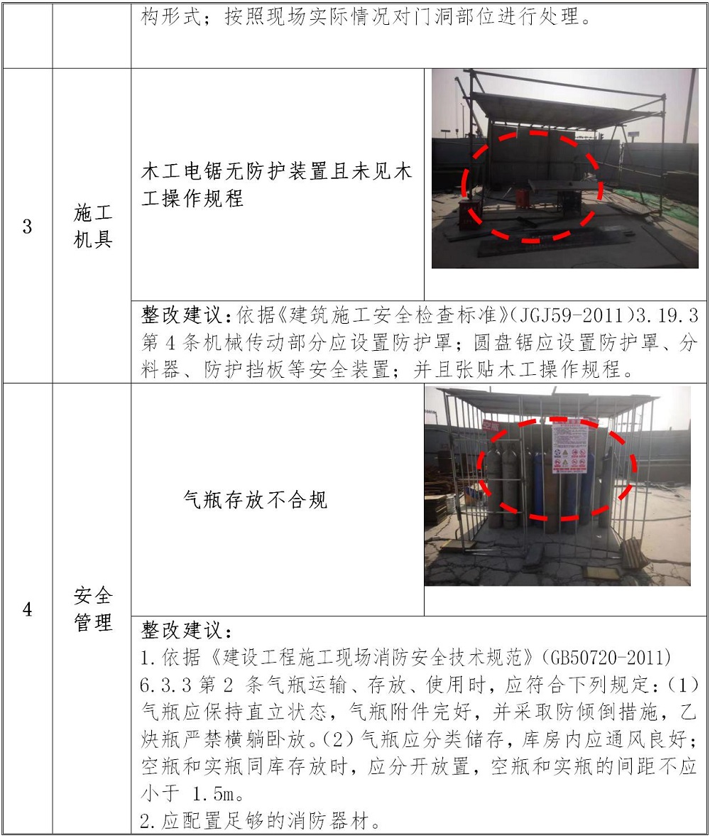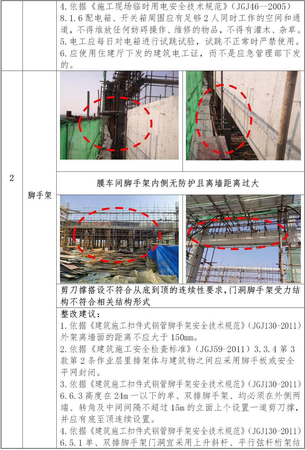 2.徐圩新区第二水厂三期及深度处理项目:临时用电、脚手架。临时用电存在一些通常风险因素;脚手架在门洞口处没有加强脚手管的措施;有工人为了吊装钢构等,采用切割机械直接切割脚手架钢管;剪刀撑应由底至顶连续设置,中间各道剪刀撑之间的净距不应大于15米。