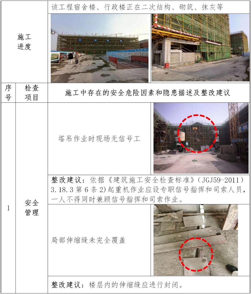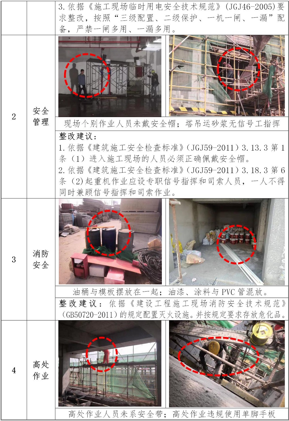 (1)安全管理方面:现场个别作业人员未戴安全帽;塔吊运砂浆无信号工指挥。