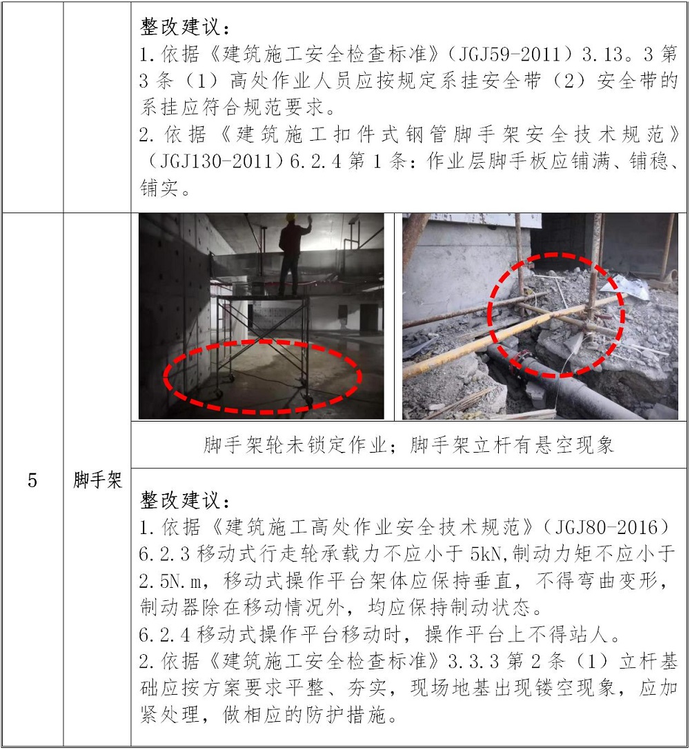 (4)脚手架:脚手架轮未锁定就进行作业;脚手架立杆有悬空现象。