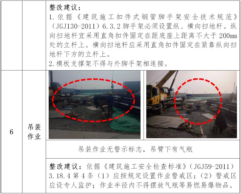 (6)吊装作业:吊装作业无警示标志,吊臂下有气瓶。