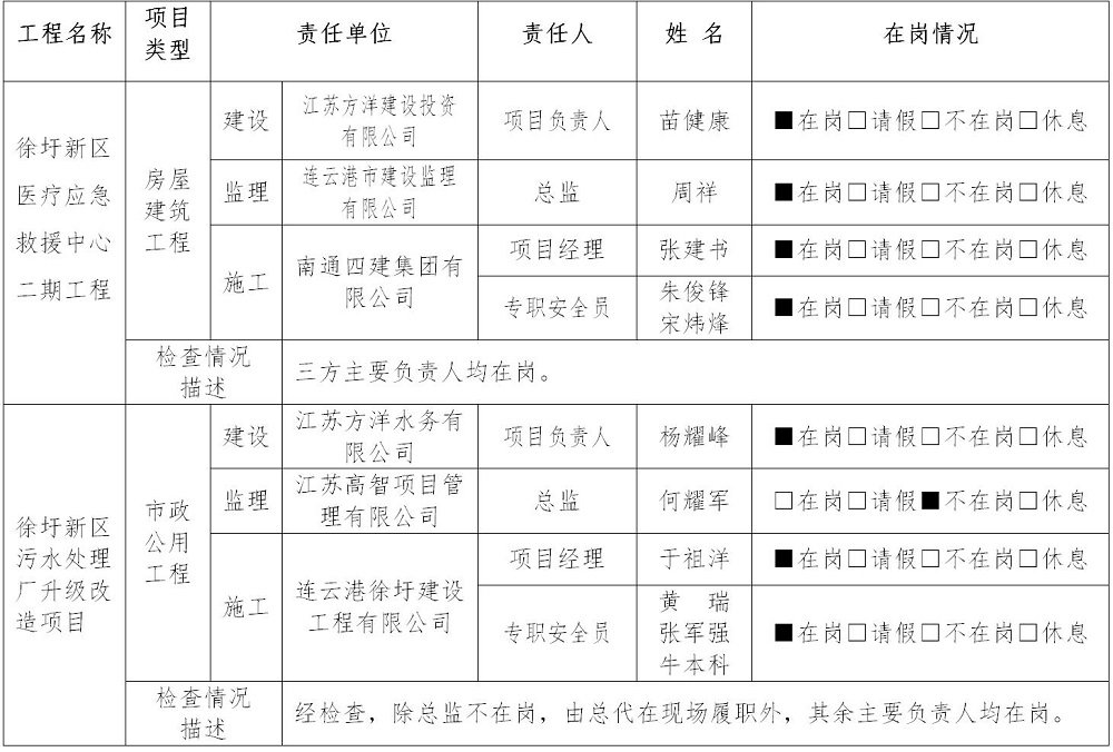 下午,中国船级社质量认证公司万象城(中国)安全监管项目组依据江苏万象城(中国)有限公司各项安全生产管理制度和《中国船级社质量认证公司江苏万象城(中国)建设工程安全监管服务项目实施方案》,对江苏方洋建设投资有限公司承建的徐圩新区医疗应急救援中心二期、江苏方洋水务有限公司承建的徐圩新区污水处理厂升级改造工程施工现场安全生产情况进行专项隐患排查。
