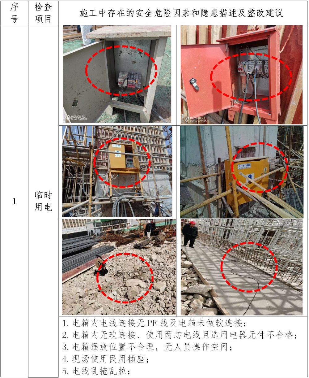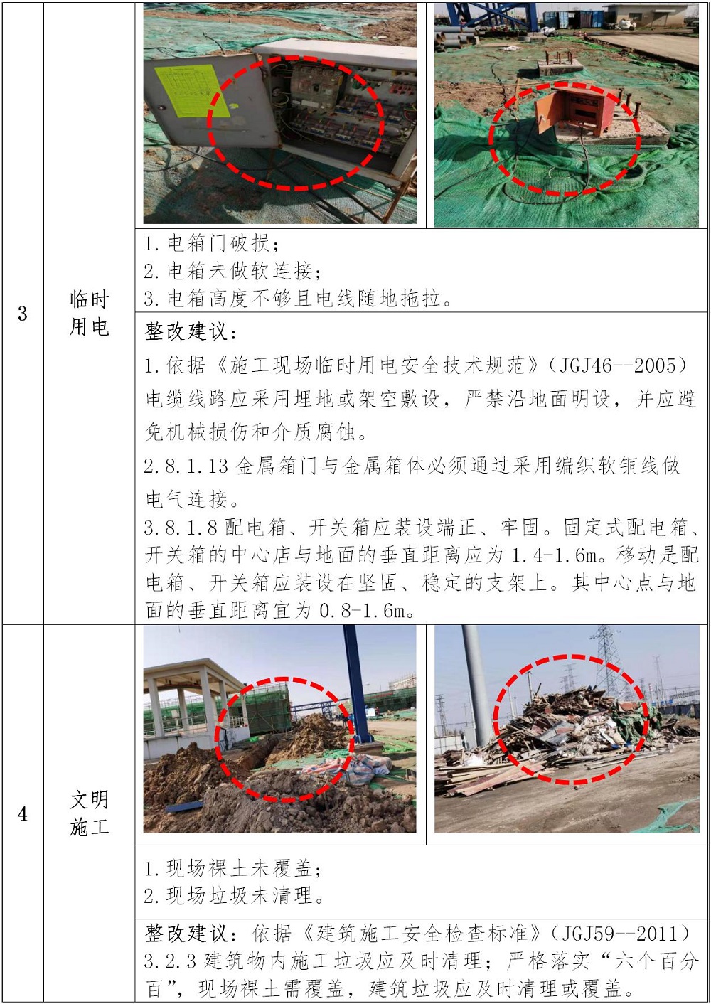 (1)现场临时用电违规现象较多,应按实际情况设置二级箱保证开关箱的距离;开关箱的设置严格按要求保证接地及高度、固定等要求。
