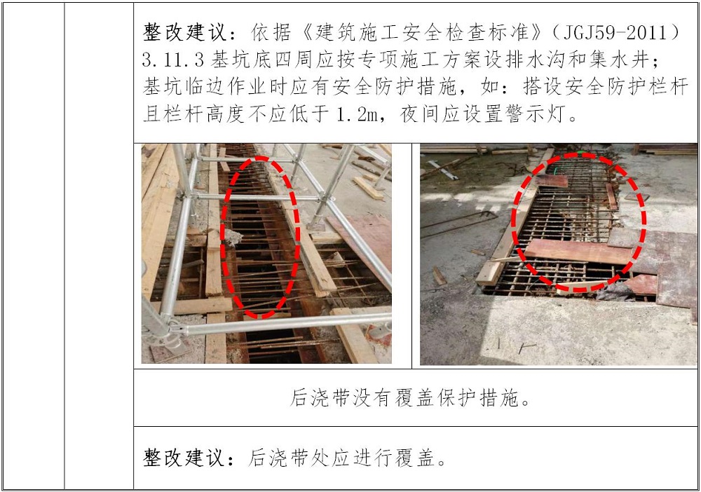 (3)后浇带没有采取覆盖保护措施;基坑支护边无临边防护。