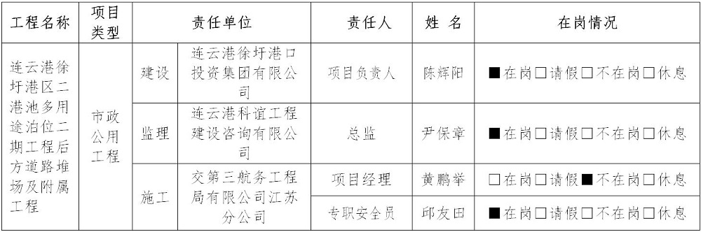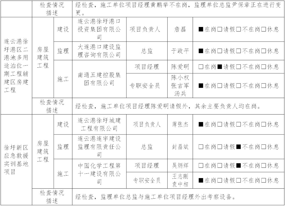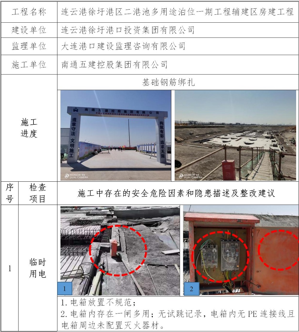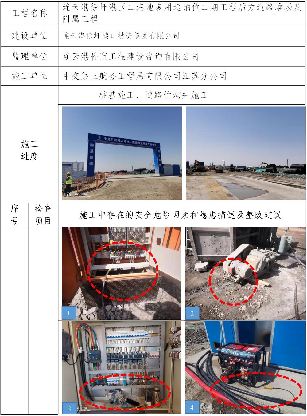 2021年3月22日,中国船级社质量认证公司万象城(中国)安全监管项目组依据万象城官方网站各项安全生产管理制度和《中国船级社质量认证公司江苏万象城(中国)建设工程安全监管服务项目实施方案》,分别对连云港徐圩港口投资集团有限公司承建的连云港徐圩港区二港池多用途泊位二期工程后方道路堆场及附属工程、连云港徐圩港区二港池多用途泊位一期工程辅建区房建工程、连云港徐圩城建工程有限公司承建的徐圩新区应急救援实训基地项目的施工现场安全生产情况进行专项隐患排查。
