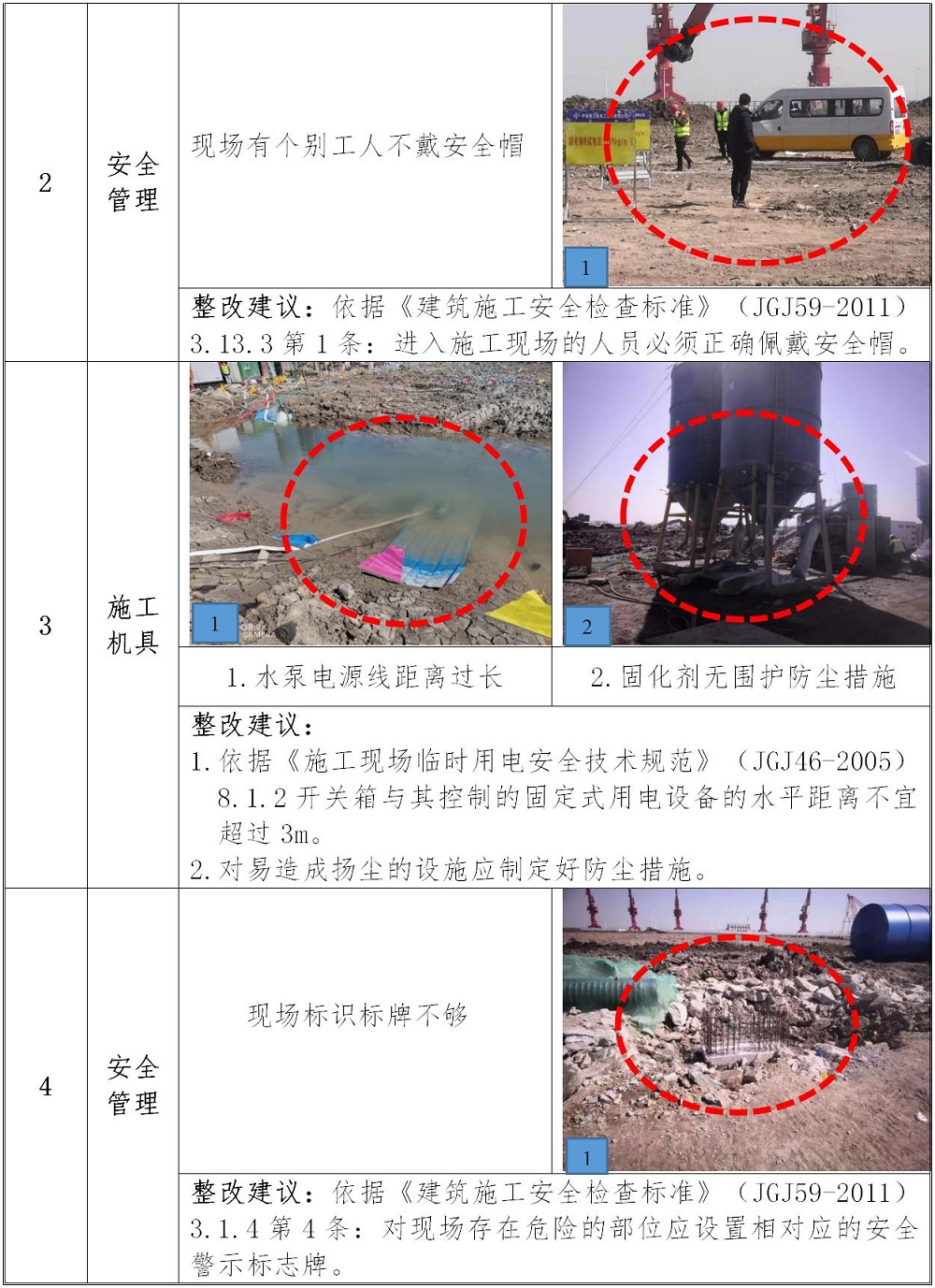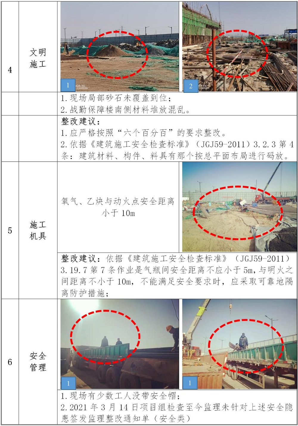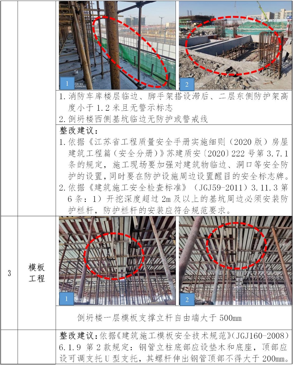(1)安全管理方面:主要是存在临边防护不到位,模板支撑立杆自由端过大(超500mm),现场安全警示标志牌过少。