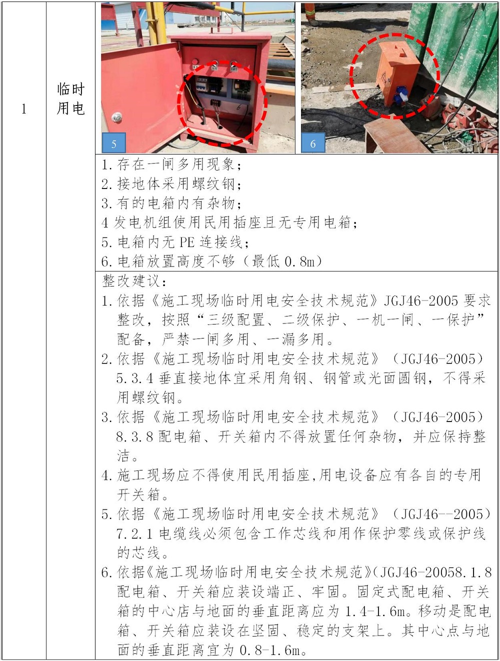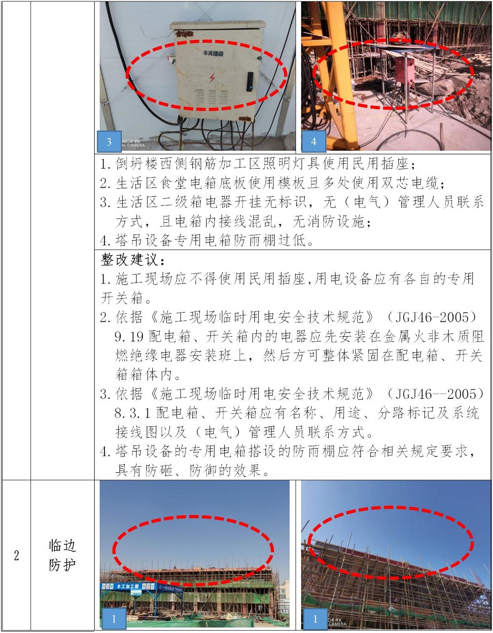 (2)施工用电方面:现场电箱一闸多机,放置不合规,使用民用插座,缺开关箱。