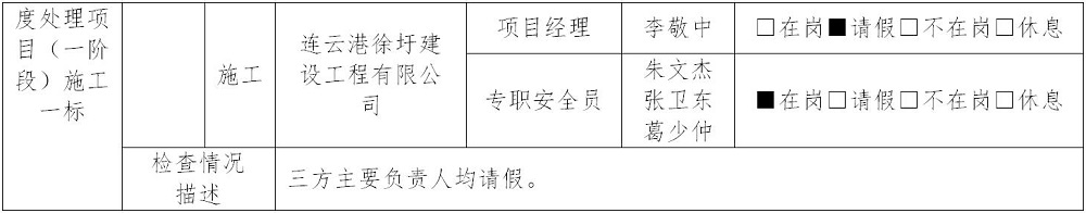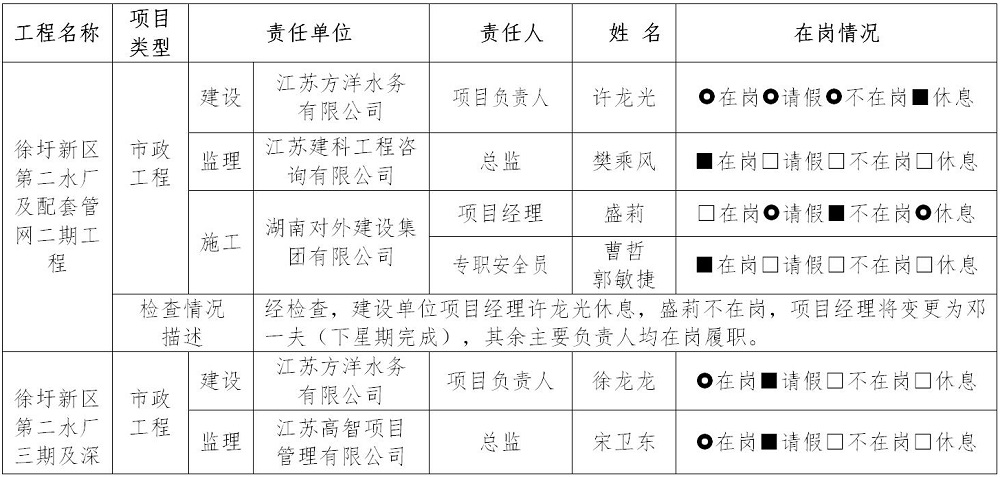 本工程除建设单位项目经理许龙光休息,盛莉不在岗,项目经理将变更为邓一夫(将下星期完成变更手续),其余主要负责人均在岗履职,检查中发现以下方面存在隐患: