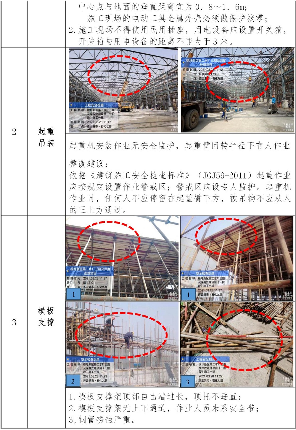 (1)安全管理方面:本工程中涉及危大工程有:多个单位工程汽车起重机安装作业及模板支撑脚手架。由于人员请假暂未查到专项方案,已建议建设单位负责人明天及时检查回复相关信息,在现场的钢结构吊装现场有多处违规现象,模板支撑架也有多处不符合要求的地方;还有临边防护部分缺失。