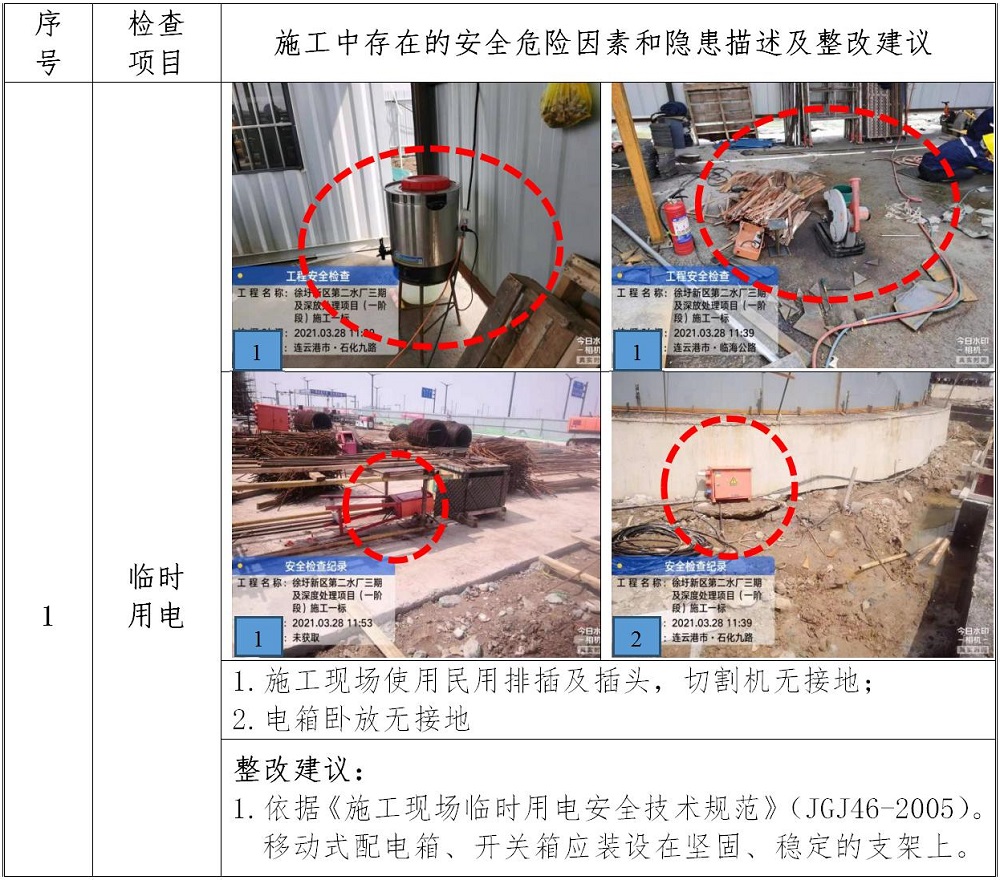 (2)施工用电方面:施工现场违规使用双芯电缆,无保护零线,还存在使用民用插座现象。