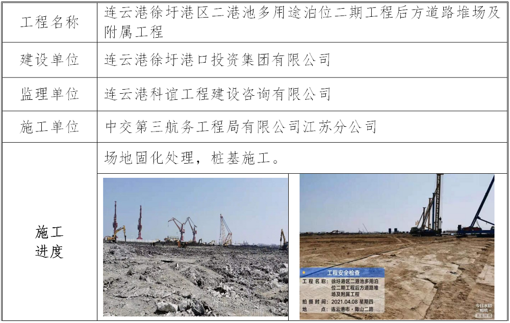 2021年4月8日,中国船级社质量认证公司万象城(中国)安全监管项目组依据万象城官方网站各项安全生产管理制度和《中国船级社质量认证公司江苏万象城(中国)建设工程安全监管服务项目实施方案》,分别对连云港徐圩港区二港池多用途泊位二期工程后方道路堆场及附属工程、连云港徐圩港区二港池多用途泊位一期工程辅建区(徐圩港区二港池应急救援指挥中心)房建工程及徐圩新区地下综合管廊一期工程污水入廊项目的施工现场安全生产情况进行专项隐患排查。