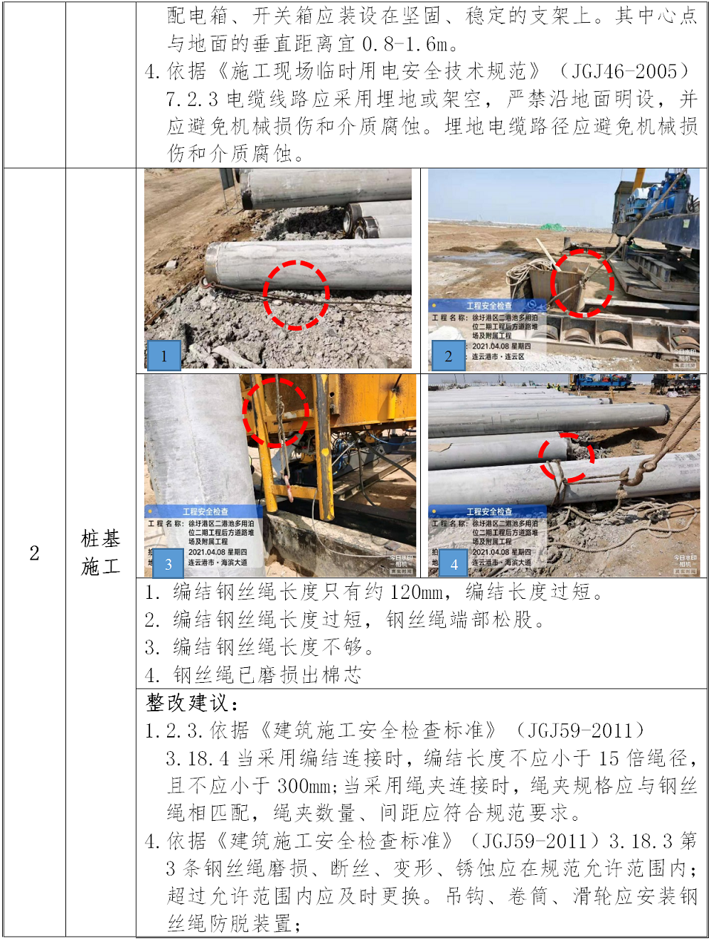 1.连云港徐圩港区二港池多用途泊位二期工程后方道路堆场及附属工程:桩机钢丝绳、临时用电