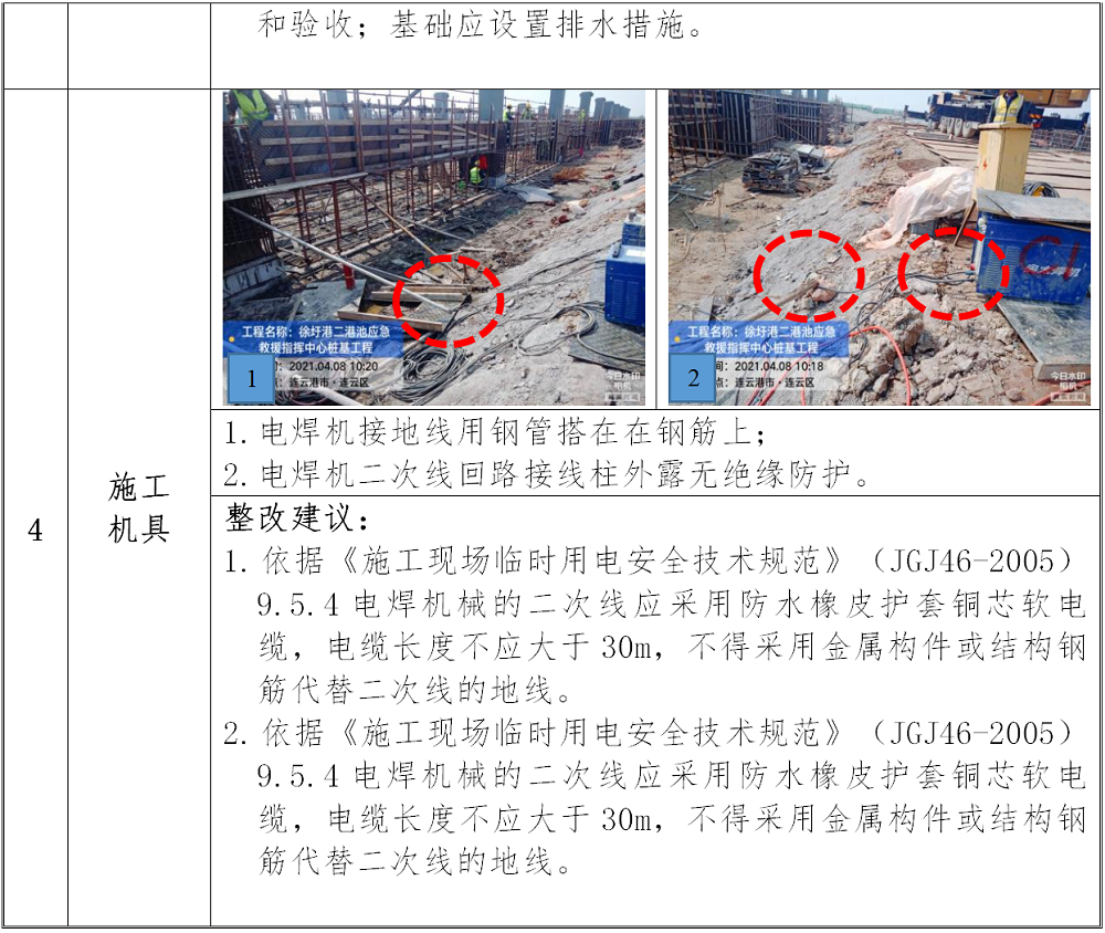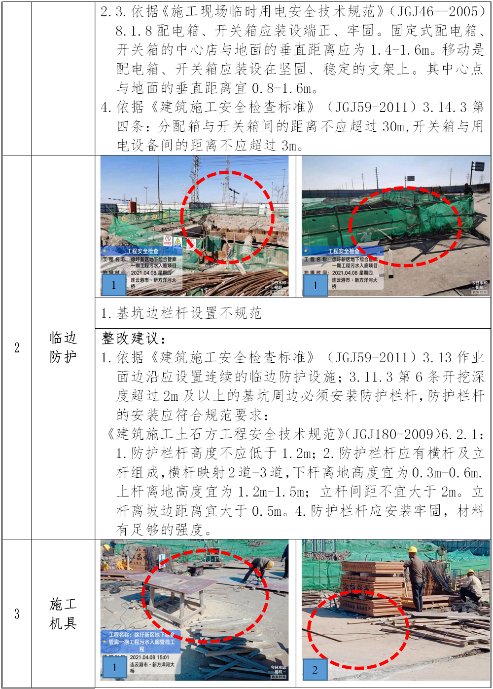 (1)将基坑周边的栏杆重新按规范要求设置。圆盘锯要求设置好防护罩,其边应单独设置开关箱,也应配置好消防器材。
