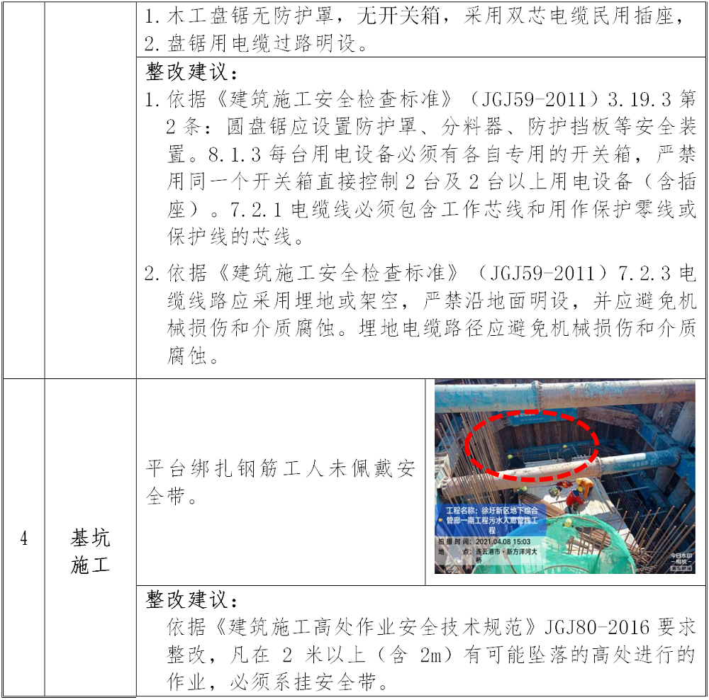 基坑边栏杆设置不符合规定要求;圆盘锯无防护罩;平台作业工人有不系安全带现象;局部裸土未覆盖。