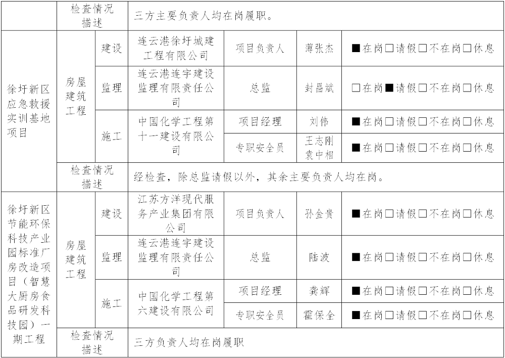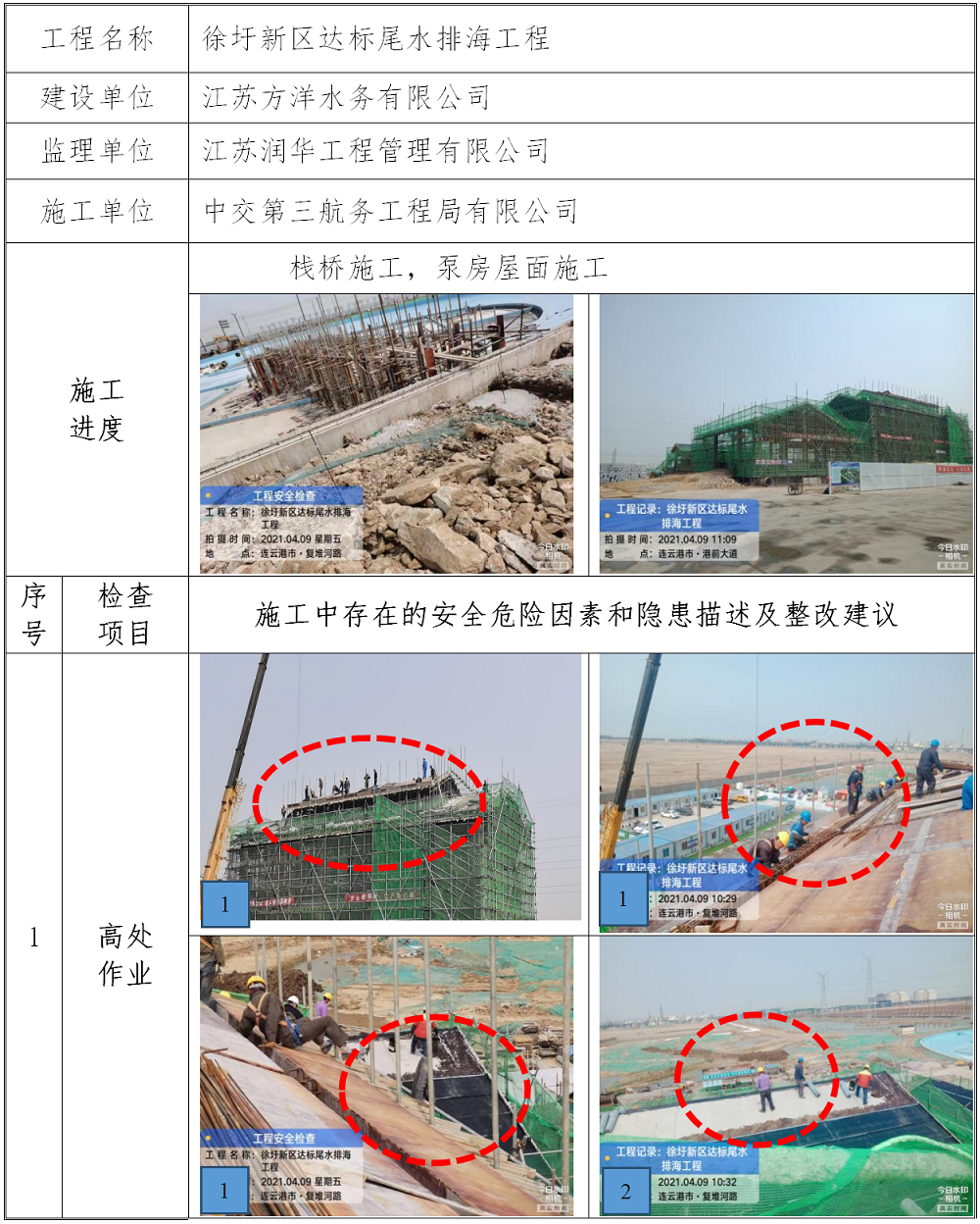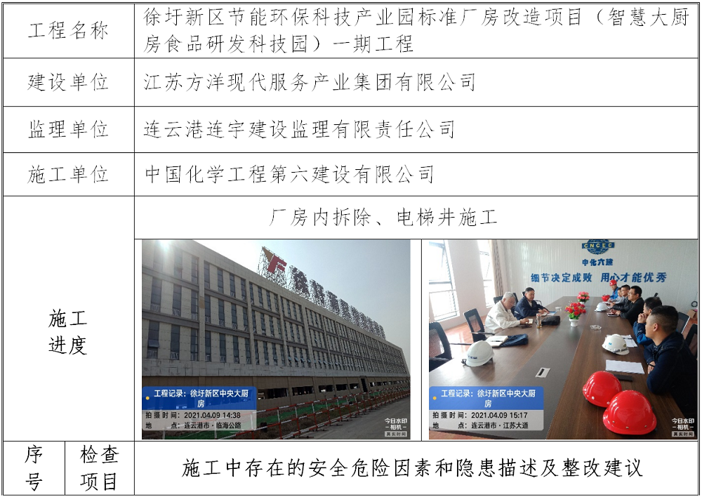 2021年4月9日,中国船级社质量认证公司万象城(中国)安全监管项目组依据万象城官方网站各项安全生产管理制度和《中国船级社质量认证公司江苏万象城(中国)建设工程安全监管服务项目实施方案》,分别对江苏方洋水务有限公司承建徐的圩新区达标尾水排海工程、江苏方洋现代服务产业集团有限公司承建的徐圩新区节能环保科技产业园标准厂房改造项目(智慧大厨房食品研发科技园)一期工程的施工现场安全生产情况进行专项隐患排查,对连云港徐圩城建工程有限公司承建的徐圩新区应急救援实训基地项目进行复查。