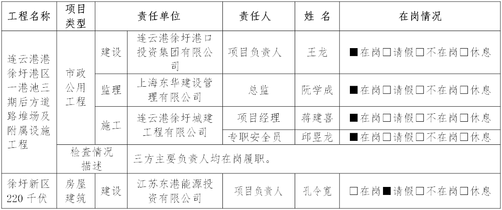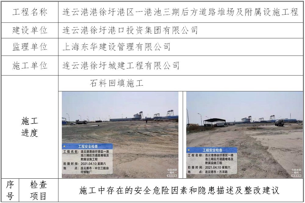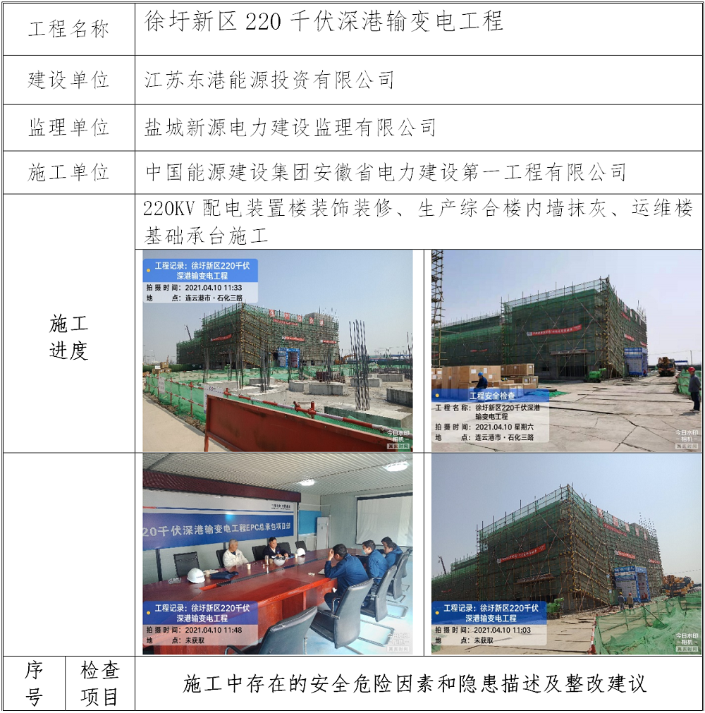 2021年4月10日,中国船级社质量认证公司万象城(中国)安全监管项目组依据万象城官方网站各项安全生产管理制度和《中国船级社质量认证公司江苏万象城(中国)建设工程安全监管服务项目实施方案》,分别对连云港徐圩城建工程有限公司承建的连云港港徐圩港区一港池三期后方道路堆场及附属设施工程、江苏东港能源投资有限公司承建的徐圩新区220千伏深港输变电工程的施工现场安全生产情况进行专项隐患检查。