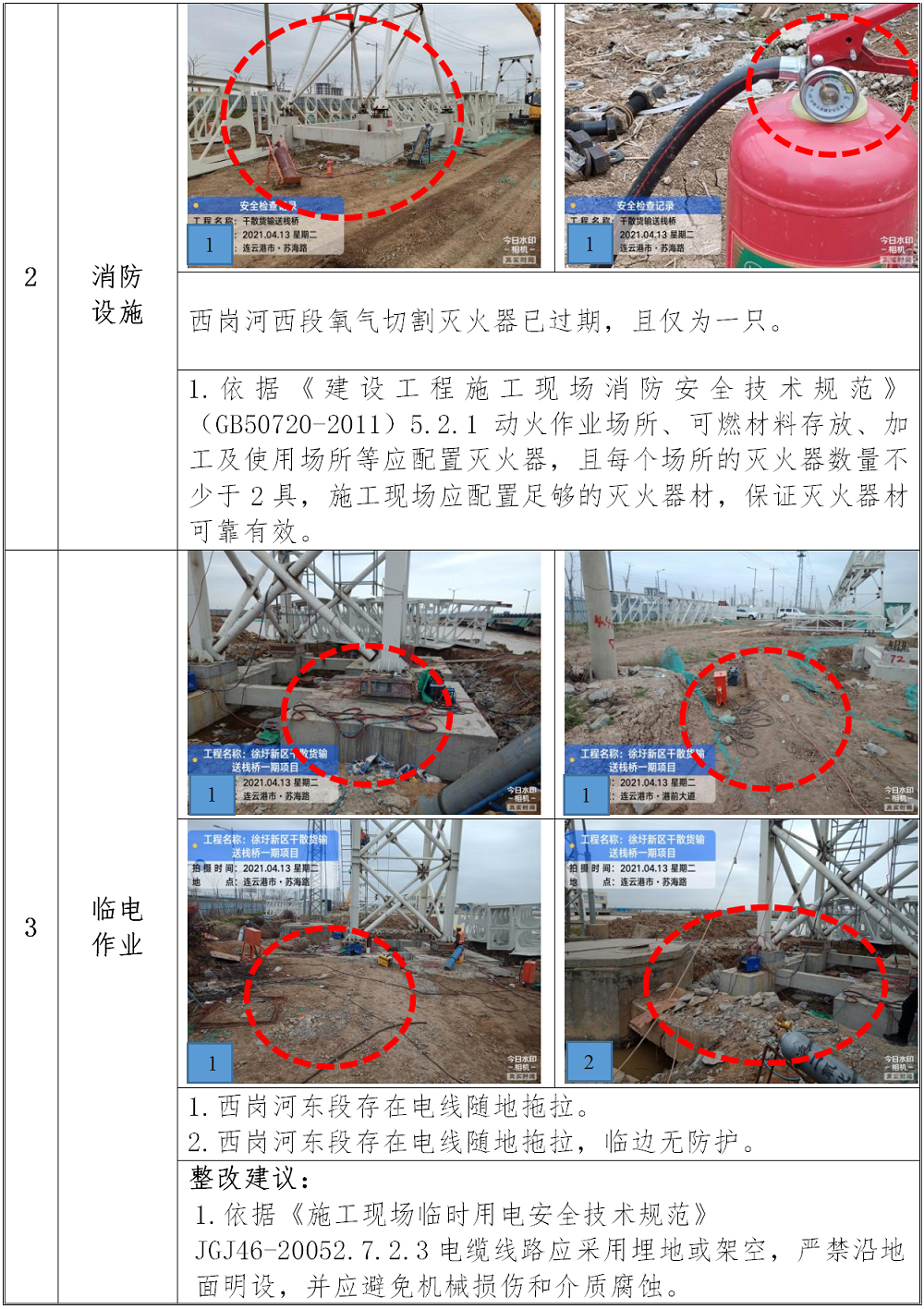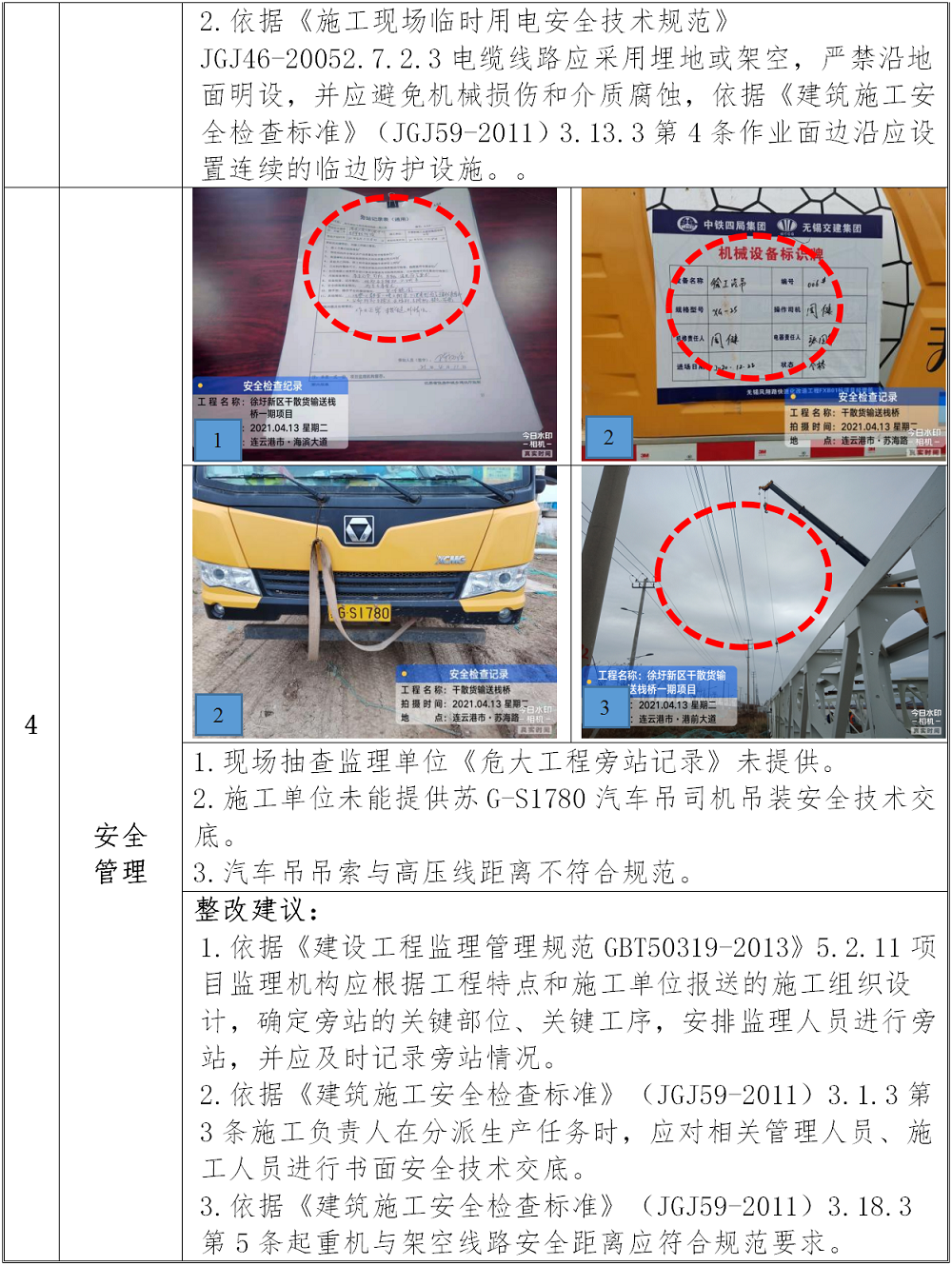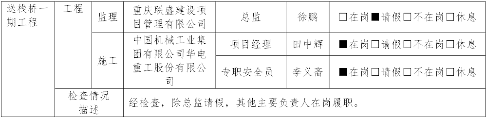 本工程除总监请假,其他主要负责人在岗履职。目前该项目正在进行西岗所段栈桥钢结构吊装。检查中发现以下方面存在隐患: