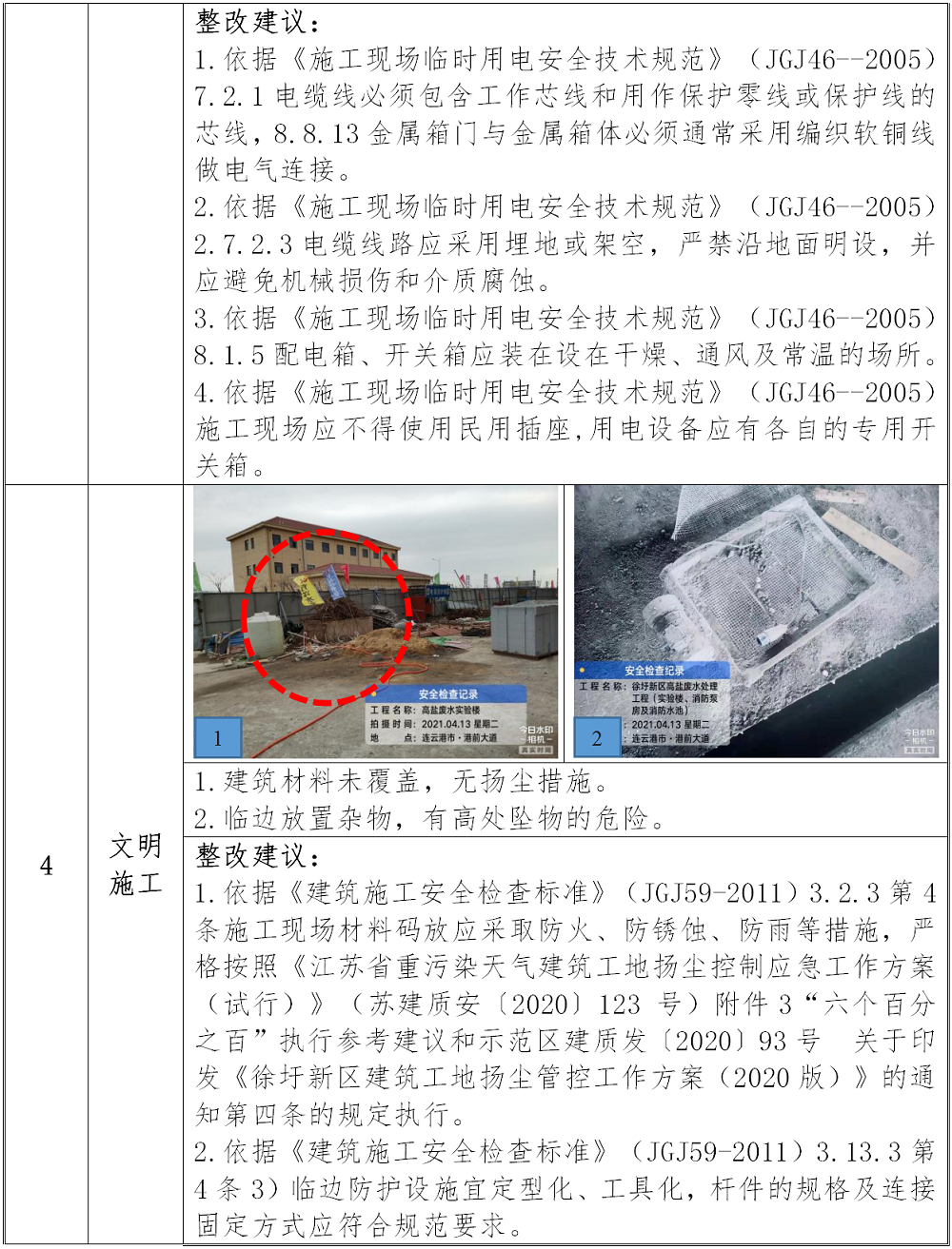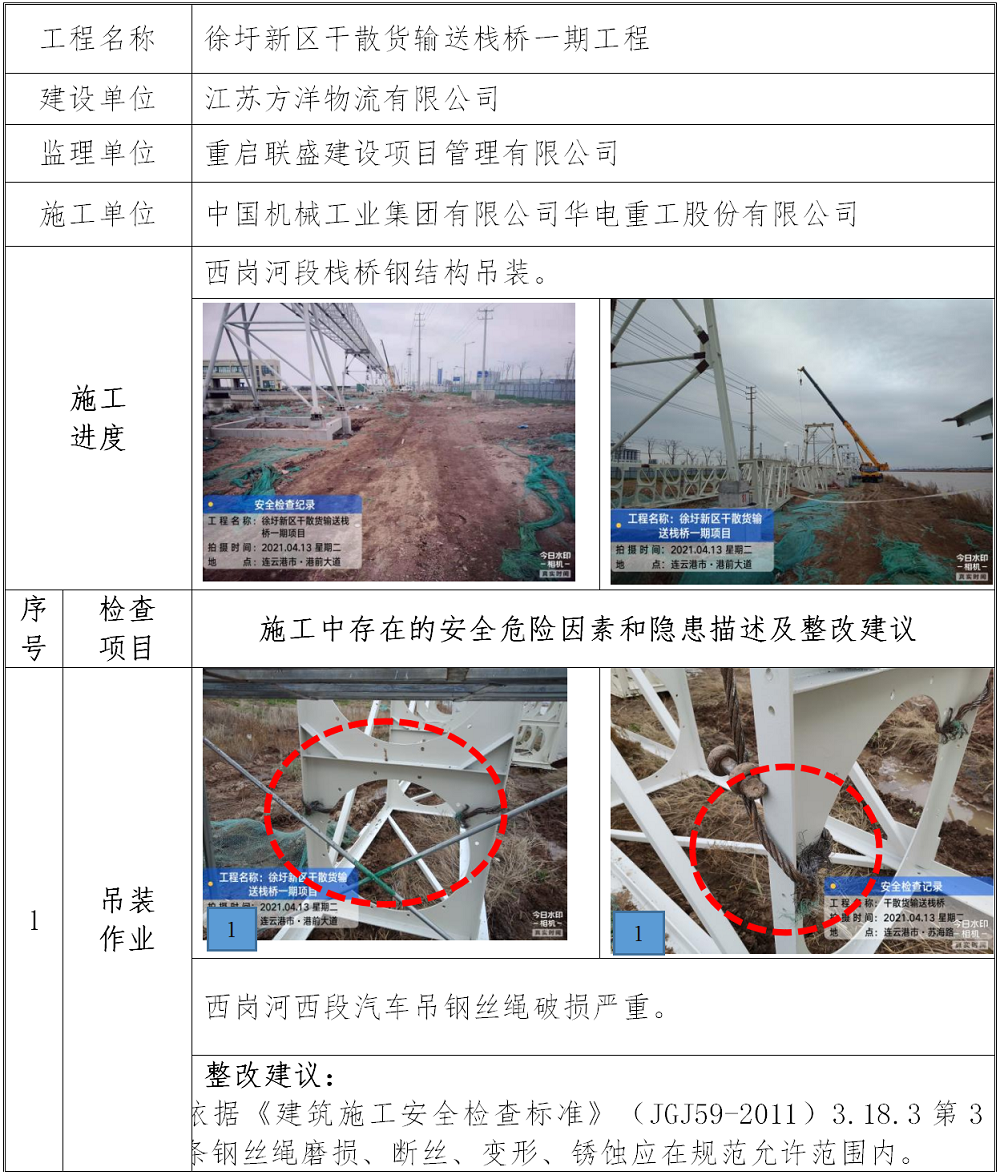 2021年4月13日,中国船级社质量认证公司万象城(中国)安全监管项目组依据万象城官方网站各项安全生产管理制度和《中国船级社质量认证公司江苏万象城(中国)建设工程安全监管服务项目实施方案》,分别对江苏方洋水务有限公司承建的徐圩新区高盐废水工程实验楼建设项目、江苏方洋物流有限公司承建的徐圩新区干散货输送栈桥一期工程的施工现场安全生产情况进行专项隐患排查。