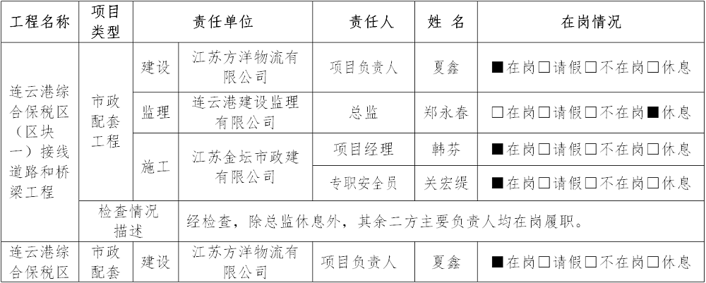 本工程除总监休息外,其余二方主要负责人均在岗履职。目前该项目正在进行钢构吊装。检查中发现以下方面存在隐患: