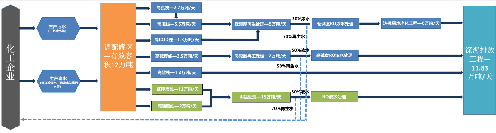 依据连云港石化产业基地总体规划及环评中污废水整体回用率不低于70%的要求,2021年3月建成投用了目前全国工业园区单体规模最大的【再生水厂】,处理规模为10万吨/日。再生水厂承接东港污水处理厂、第三方治理工程的达标尾水和企业直接排放的生产废水,处理后将70%污废水回用至上游企业,预计每年减少污水外排量和新鲜水取用量2500万吨,优化了新区的供水格局,缓解了供水紧张的局面。