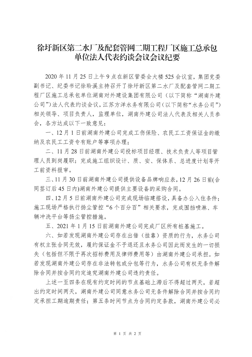 为确保徐圩新区第二水厂及配套管网二期工程早日开工建设,尽快提升工业水供应能力,全力保障盛虹炼化使用需求,11月25日上午,集团对该项目总承包单位湖南对外建设集团有限公司法人进行了约谈,现将约谈情况予以公示。