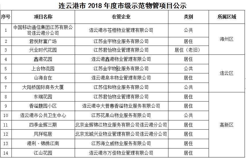 日前,连云港市住房和城乡建设局公示了《2018年度连云港市市级示范物管项目名单》,由连云港云帆物业服务有限公司提供服务的国际物流服务中心公共物业项目成功获评。