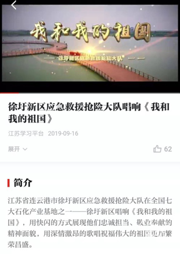 热烈庆祝徐圩新区应急救援抢险大队(186大队)《我和我的祖国》快闪视频荣登“学习强国”平台!