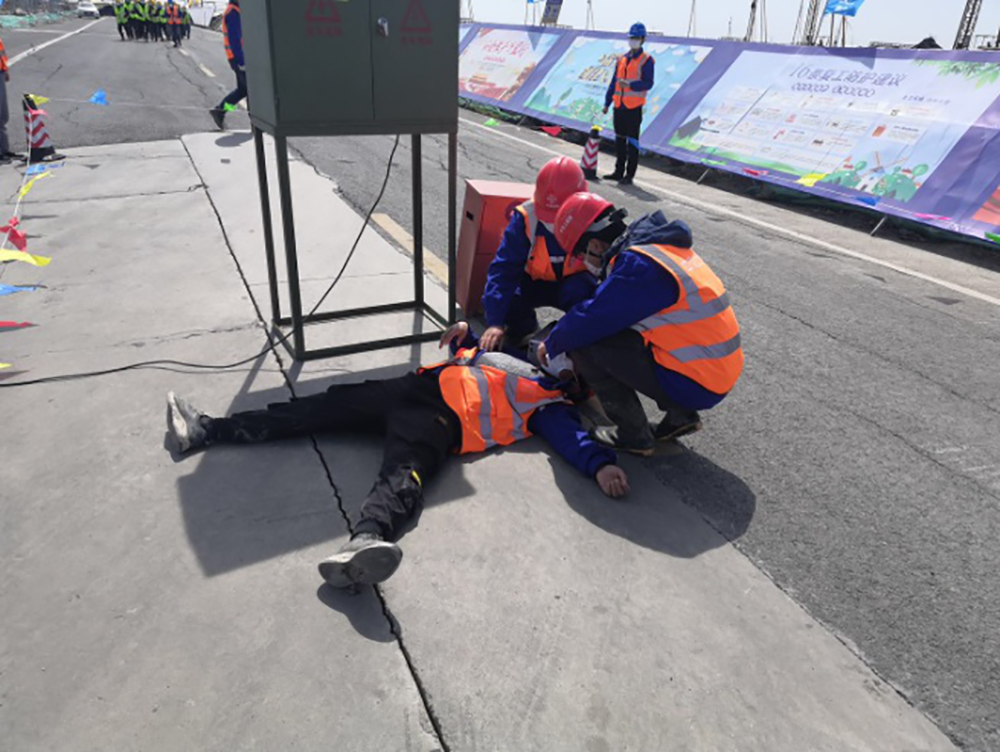 演练现场,模拟安全事故发生后,本项目应急救援小组现场指挥负责人在接到紧急报告后,立刻启动应急预案并模拟上报徐圩新区建设主管部门。各应急小组迅速反应,即刻实施拉闸断电、设置警戒区、疏散人群、对受伤人员进行心肺复苏等应急处置,并由项目急救车辆送往徐圩新区医院治疗。