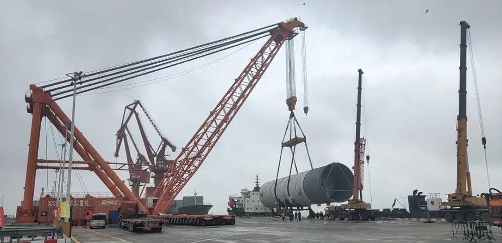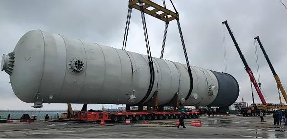 2020年6月18日,徐圩港投公司顺利完成800吨重件卸船装车任务。此次运抵徐圩港区的大件设备EO吸收塔是卫星石化建设的关键性设备,该吸收塔的作用是将EO从循环气体中分离出来,设备直径9.7米、长度50米,设备连鞍座已超过820吨。