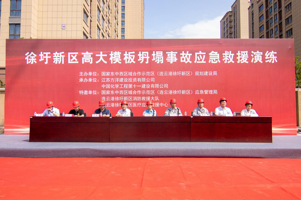 为树牢新区企业安全发展理念,压实安全生产责任,提高员工对事故应急的处理能力,6月30日,由徐圩新区规划建设局主办,江苏方洋建设投资有限公司、中国化学工程第十一建设有限公司承办,新区应急管理局、消防救援大队、医疗应急救援中心应邀参加的徐圩新区高大模板坍塌事故应急救援演练活动在徐圩新区公共租赁住房三期项目建筑施工现场内举行。