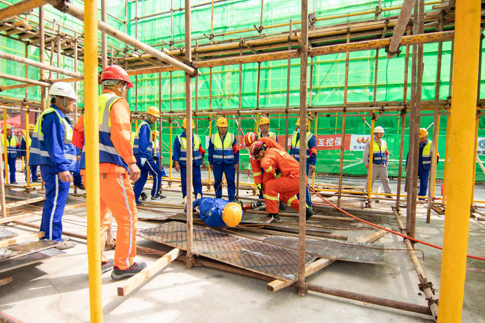 演练模拟施工过程中发生高大模板坍塌事故,并有工人受伤被困。事故发生后,项目部立即启动应急预案,成立以项目经理为首的应急救援小组,下设报警联络组、警戒疏散组、技术保障组、抢险救援组、医疗救护组,各小组各司其职,组织人员快速施救,同时积极协调消防救援、医疗应急救援中心进行现场施救,经过各单位通力协作和密切配合,伤员被送往医院,解除预警,整个过程一气呵成,处理得当,各项演练任务圆满完成。