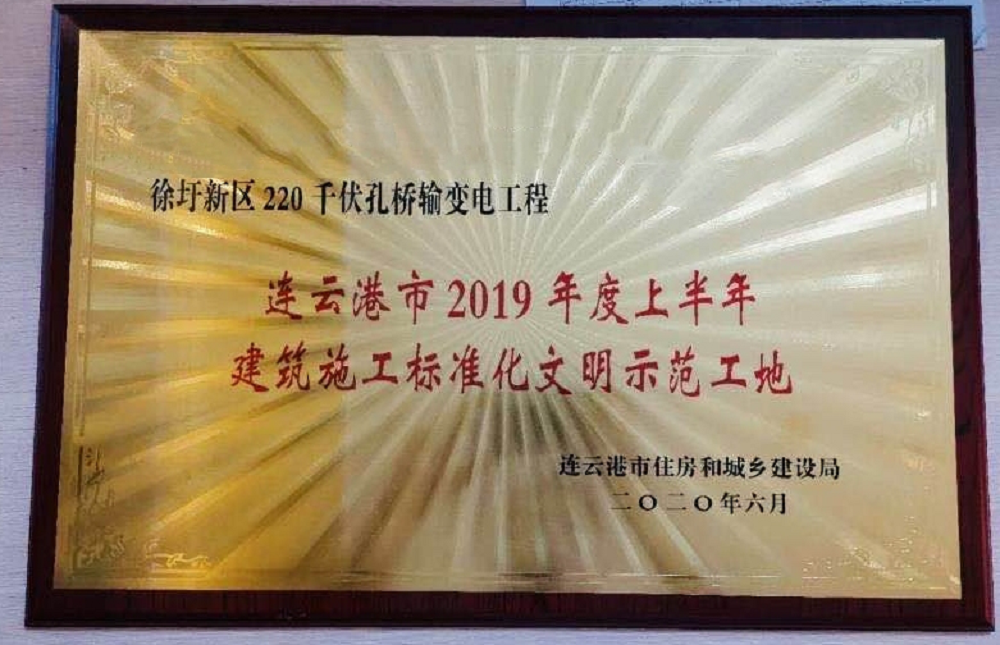 近日,从连云港市住房和城乡建设局获悉,江苏东港能源投资有限公司220kV孔桥输变电工程喜获“连云港市2019年度上半年建筑施工标准化文明示范工地”荣誉称号。